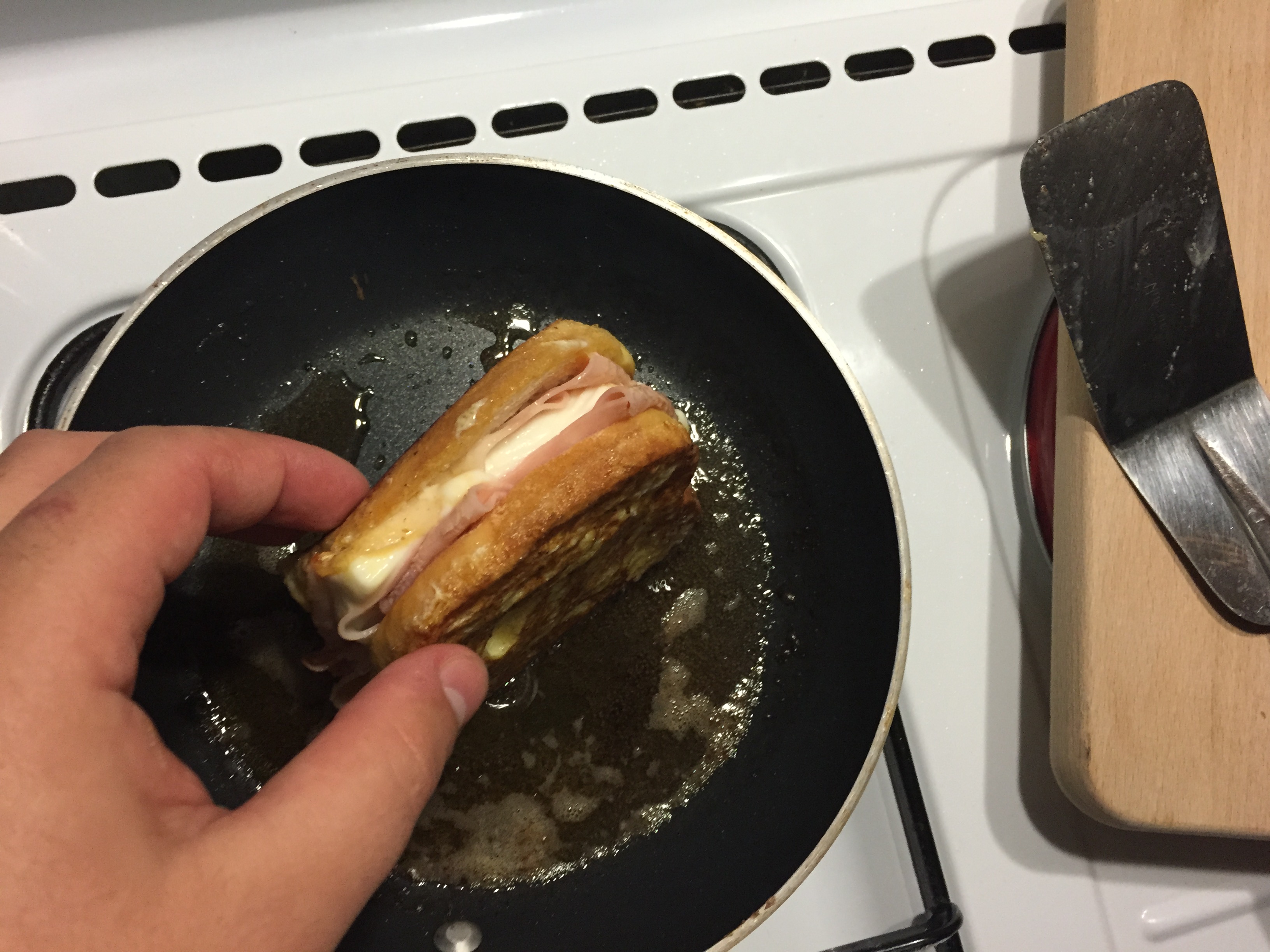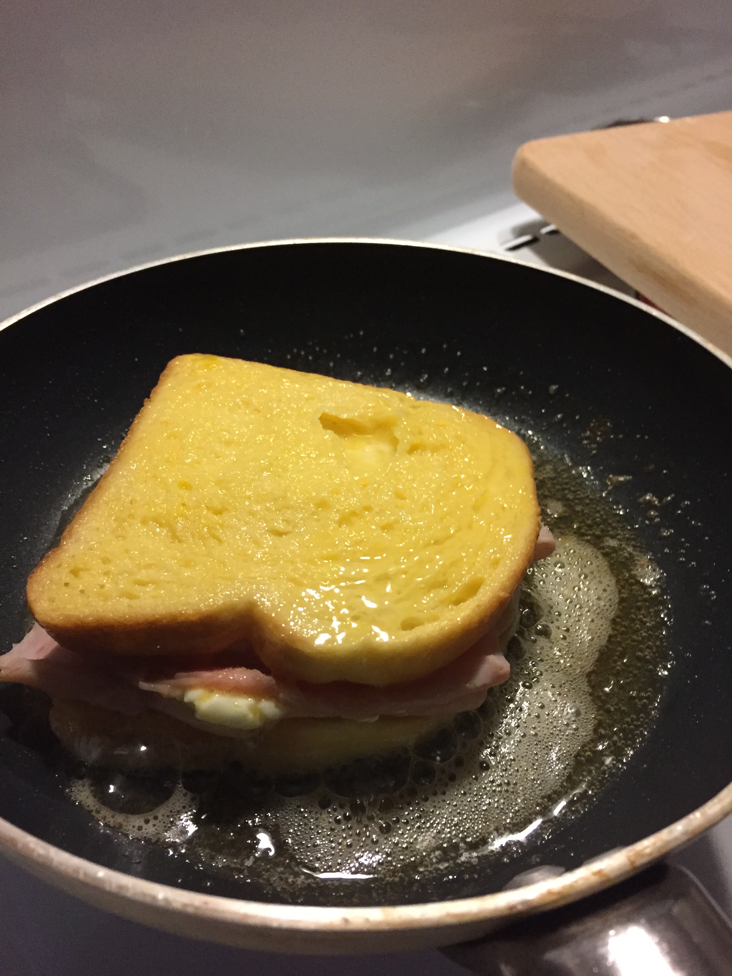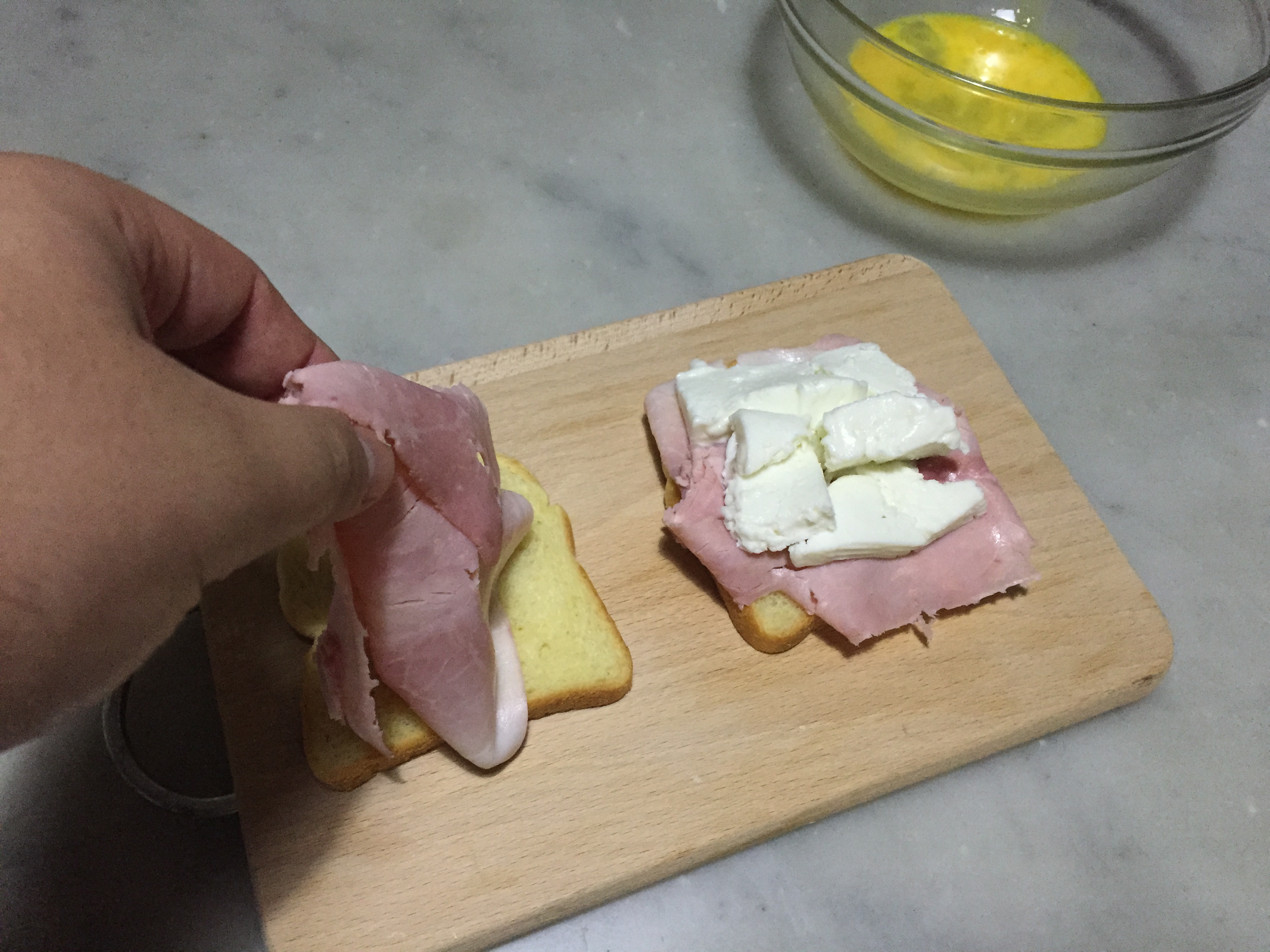 Si tratta di due fette di pan brioche (quello che al 5 stelle dove lavoravo davano con le colazioni o con il servizio di formaggi, mostarde e confetture), due fette di prosciutto cotto di Praga e come formaggio al centro del Brie.