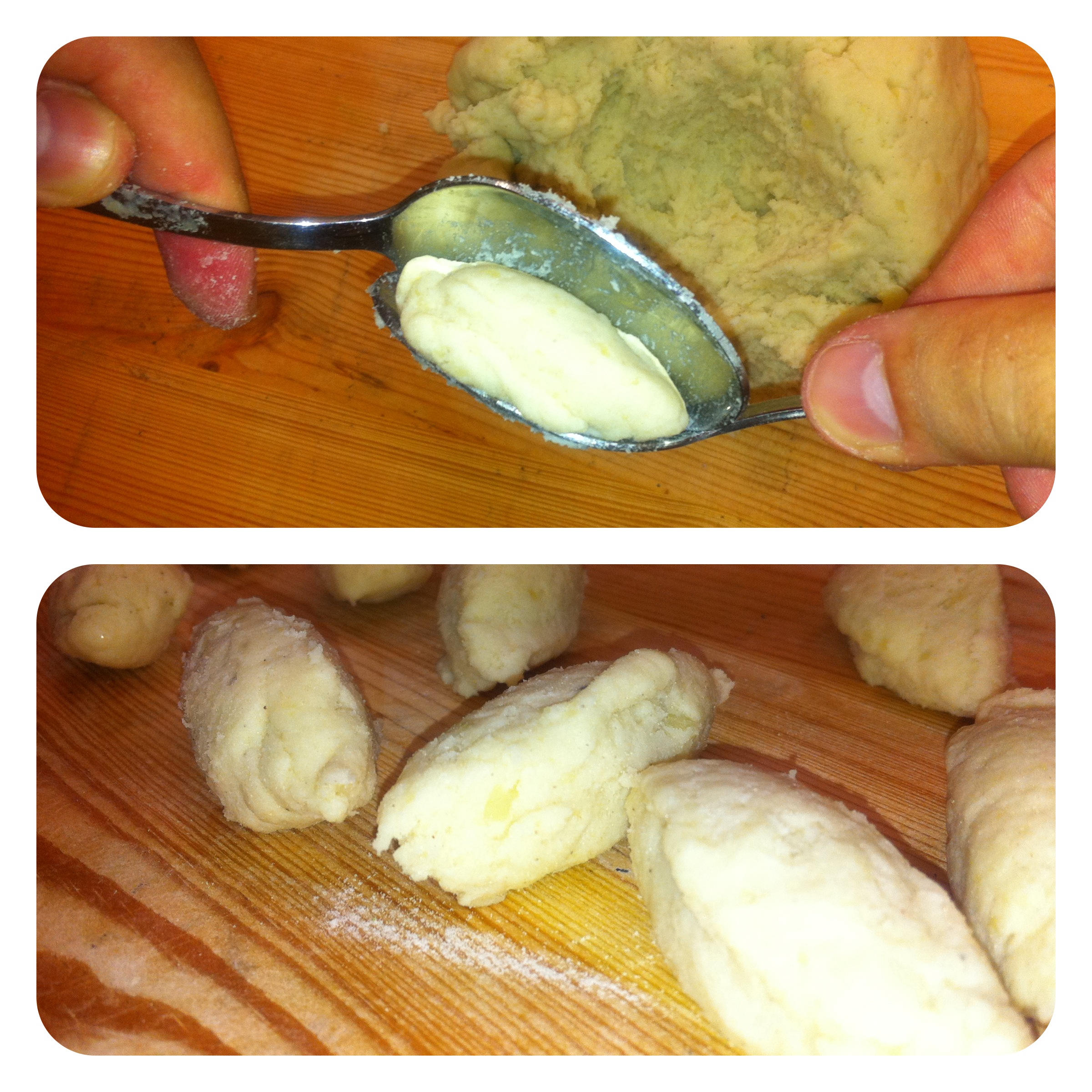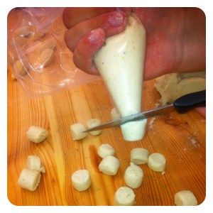 Impastare il tutto con le patate schiacciate ancora calde quindi vi si apre una selezione di moltissimi tipi di pezzatura… Infatti questi gnocchi, a seconda della percentuale di ricotta che metterete, si riveleranno decisamente duttili. Qui vi faccio vedere la pezzatura a quenelle e la più facile e regolare con il sac à poche che, credo, troverete particolarmente interessante…