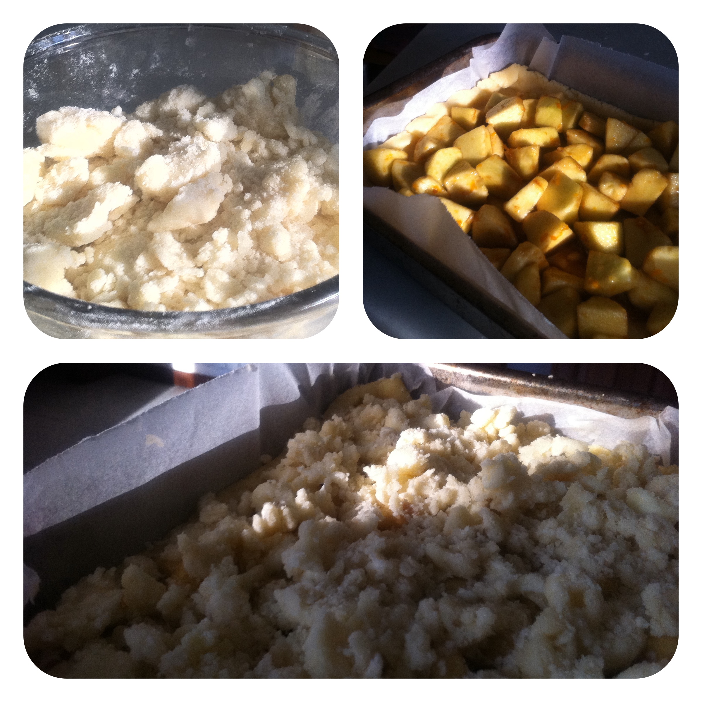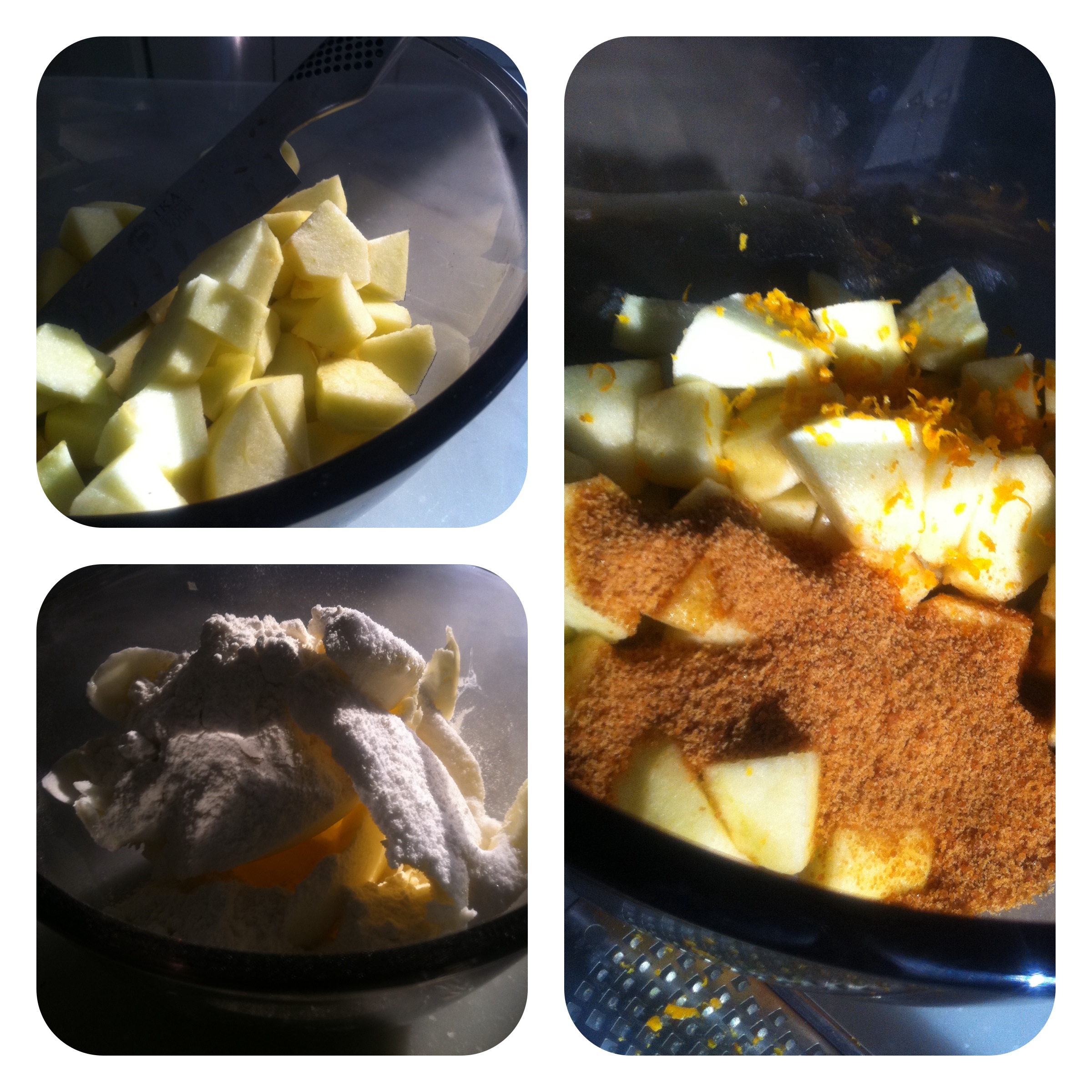 Prima di tutto ridurre le mele a cubetti e aggiungervi in una ciotola zucchero di canna grezzo, buccia d’arancia e un cucchiaio di maizena. Quindi stendete la pasta frolla in una tortiera in modo da ricoprirla con uno strato alto almeno 6 o 7 mm. Quindi porre le mele nella tortiera ricoprendo la frolla. Ricoprire poi le mele con briciole di burro con zucchero e farina incorporate a mano senza ottenere un impasto uniforme. Il composto deve essere appunto sbriciolato in superficie, quindi infornare a 160-170°C per una mezz’oretta. ATTENZIONE a non far bruciare il fondo di frolla per far colorare la superficie e viceversa… Può capitare…