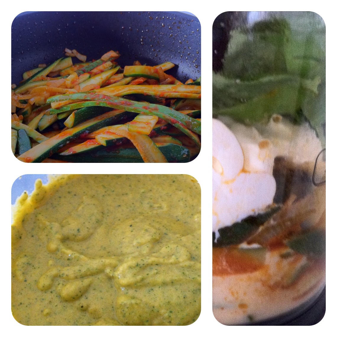 Dunque, per prima cosa rosolare scalogno e aglio con olio e concentrato di pomodoro (il concentrato deve SEMPRE essere rosolato, per restare dolce) quindi rosolare le zucchine. Una volta segnate e ben calde porre il tutto in un frullatore con ancora 2 o 3 cucchiai di olio extravergine, qualche foglia di basilico e 2 o 3 cucchiai di panna da cucina (potete sostituirla con ricotta o addirittura non aggiungere nulla. Frullare finchè non si otterrà una crema uniforme e scaldare nella padella delle zucchine il guanciale tagliato a cubetti.