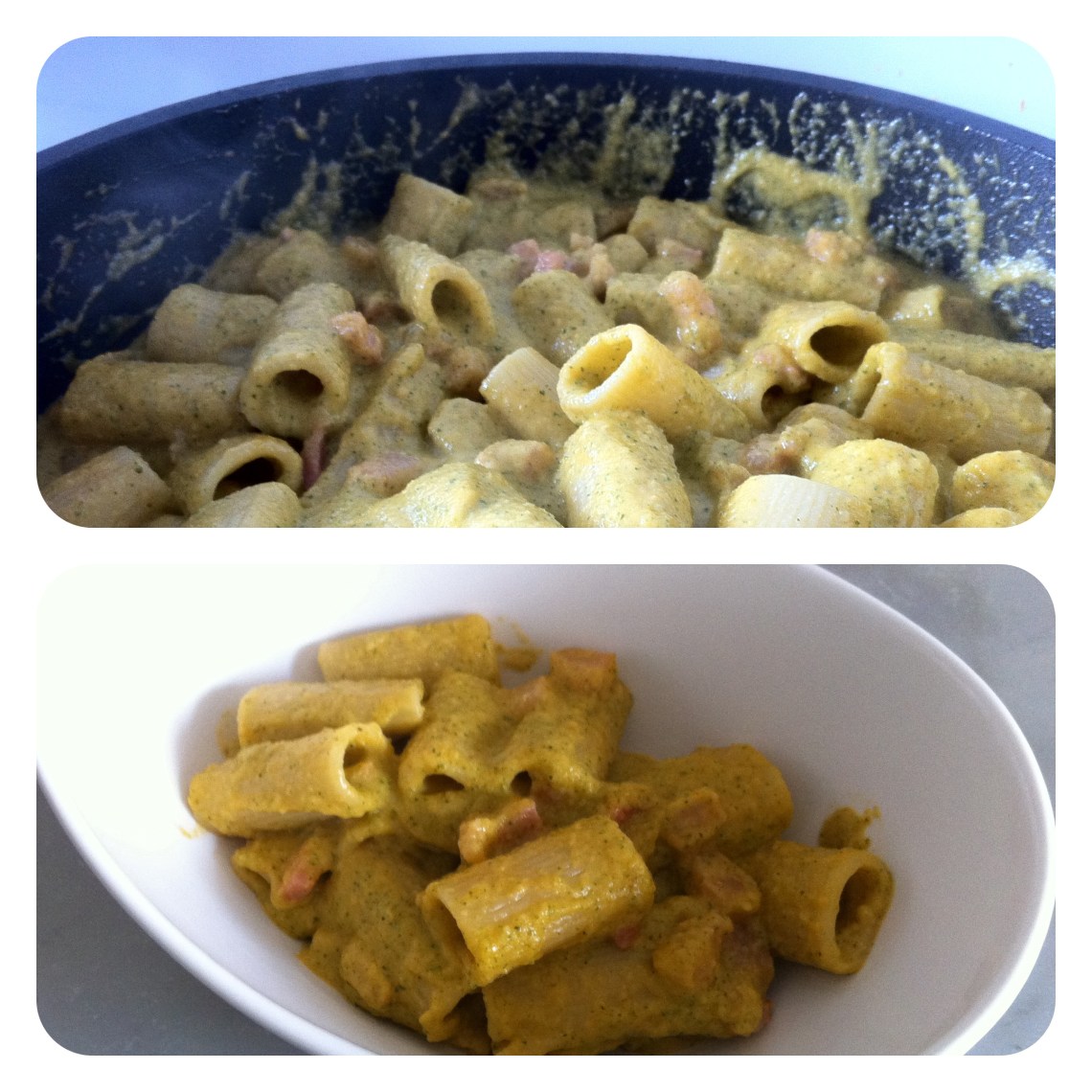 Avevo voglia di carbonara (o almeno della sua consistenza), ma allo stesso momento volevo fare la torta, e le uova bastavano solo per una delle due preparazioni (dato che non avevo intenzione di vestirmi ed uscire a recuperarne altre), quindi ho tirato fuori dal cilindro questa pasta che non è per niente male…