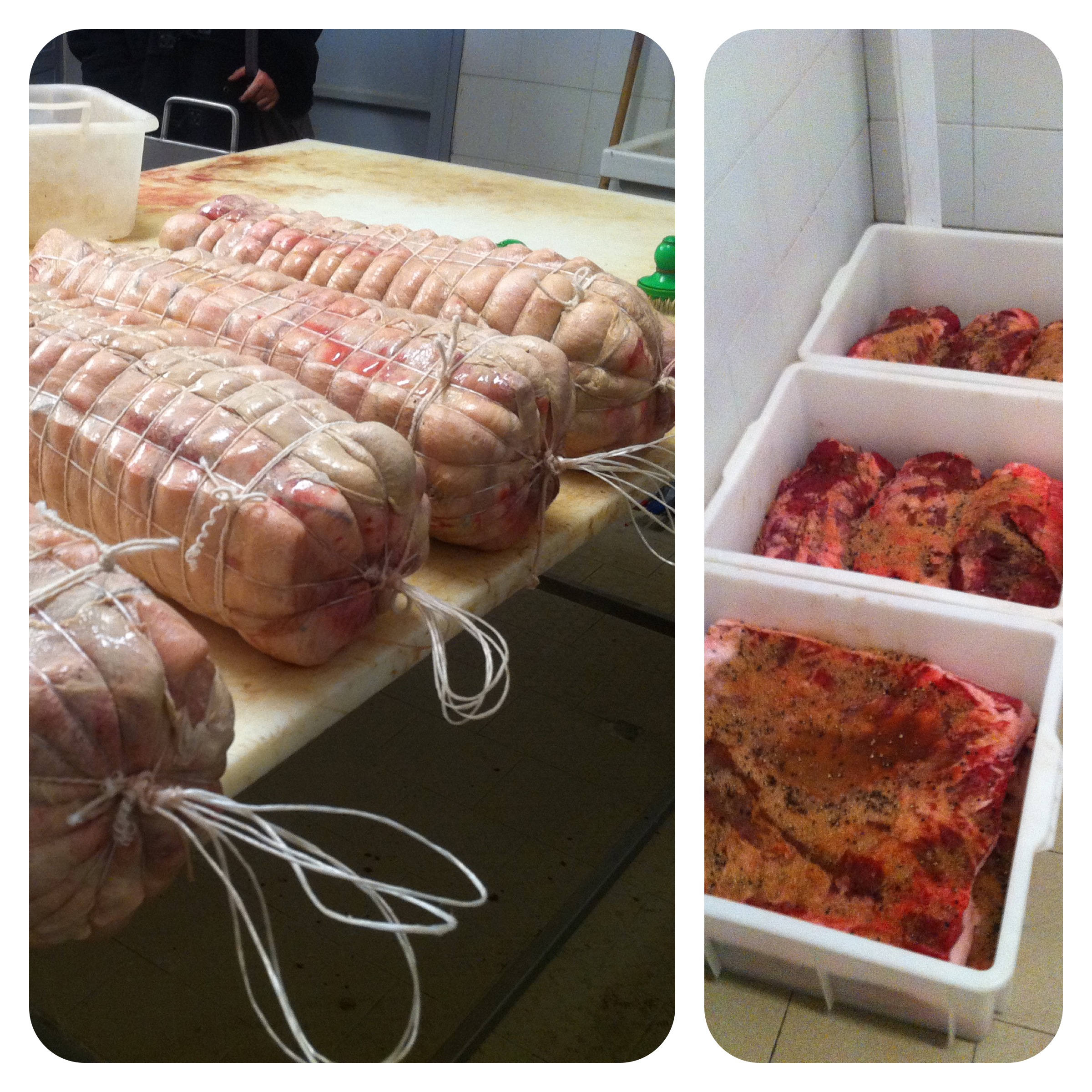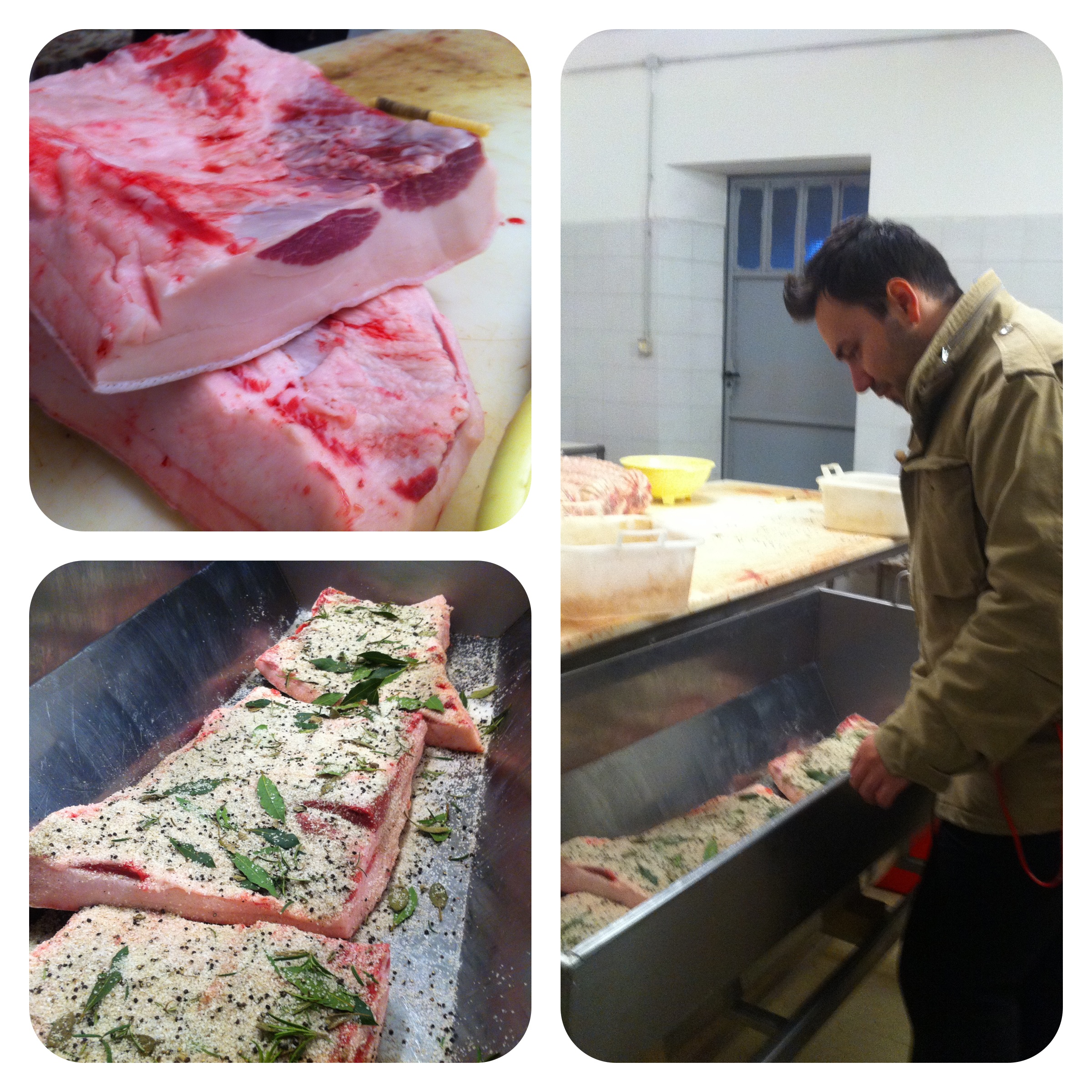 La parte più interessante per un CUOCO come me (oltre alla sapienza del maestro macellaio) è la cura e i passaggi delicati per la produzione del lardo, dei salami, delle coppe, delle pancette e dei cotechini. Sono operazioni secolari che richiedono precisione, metodo e tecnica. La percentuale e il tipo di sale, erbe e spezie. La temperatura della stanza, la sezione del budello, la legna nella stufetta della camera d’asciugatura dei salumi, il piattino con la brace e le erbe in centro alla stanza. Sono tutte tecniche e migliorie ottenute in secoli di affinamento norcino.