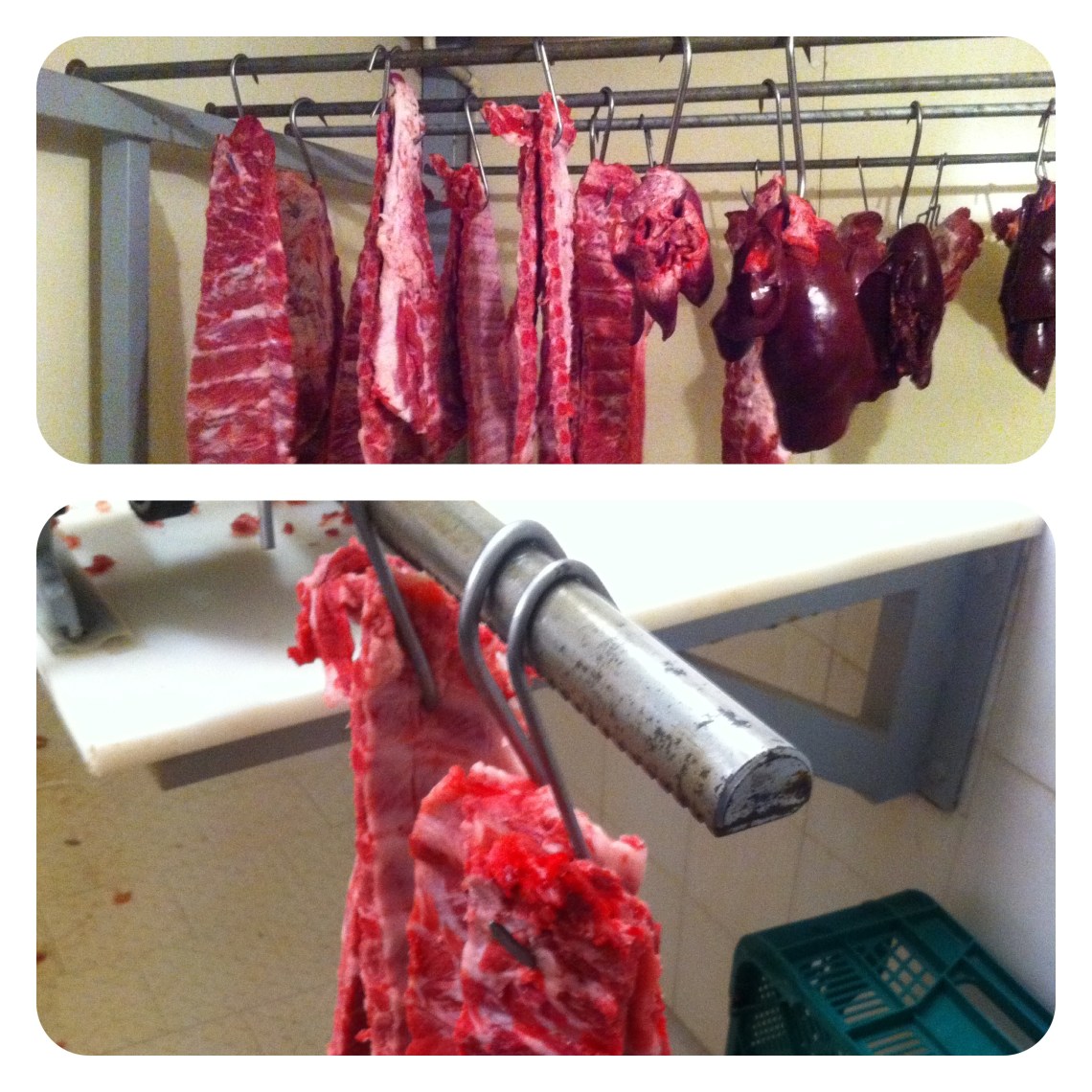 Assolutamente niente di stressante, ne lungo. Nessun urlo, nessun coltellaccio, niente schizzi. Non siamo nel film “L’albero degli zoccoli”; siamo nel 2011. Il tecnico macellaio passa una sorta pistola ad aria compressa sulla fronte dell’animale che perde la vita istantaneamente evitando che tragedie. In questo modo, tra l’altro, si fa in modo che l’acido lattico, causato da agitazione o dolore, possano intaccare le carni. Una volta dissanguato si passa alla usuale dissezione.