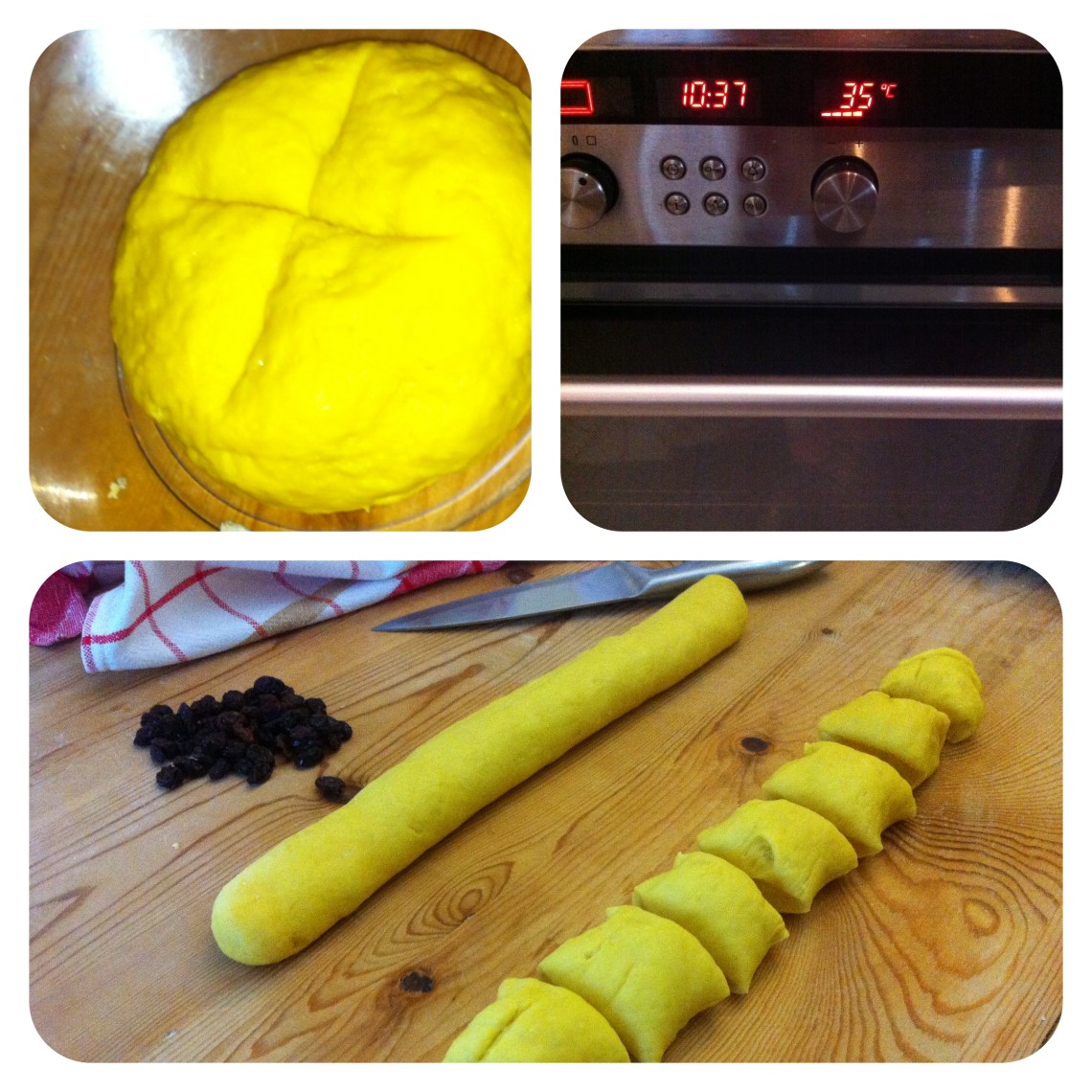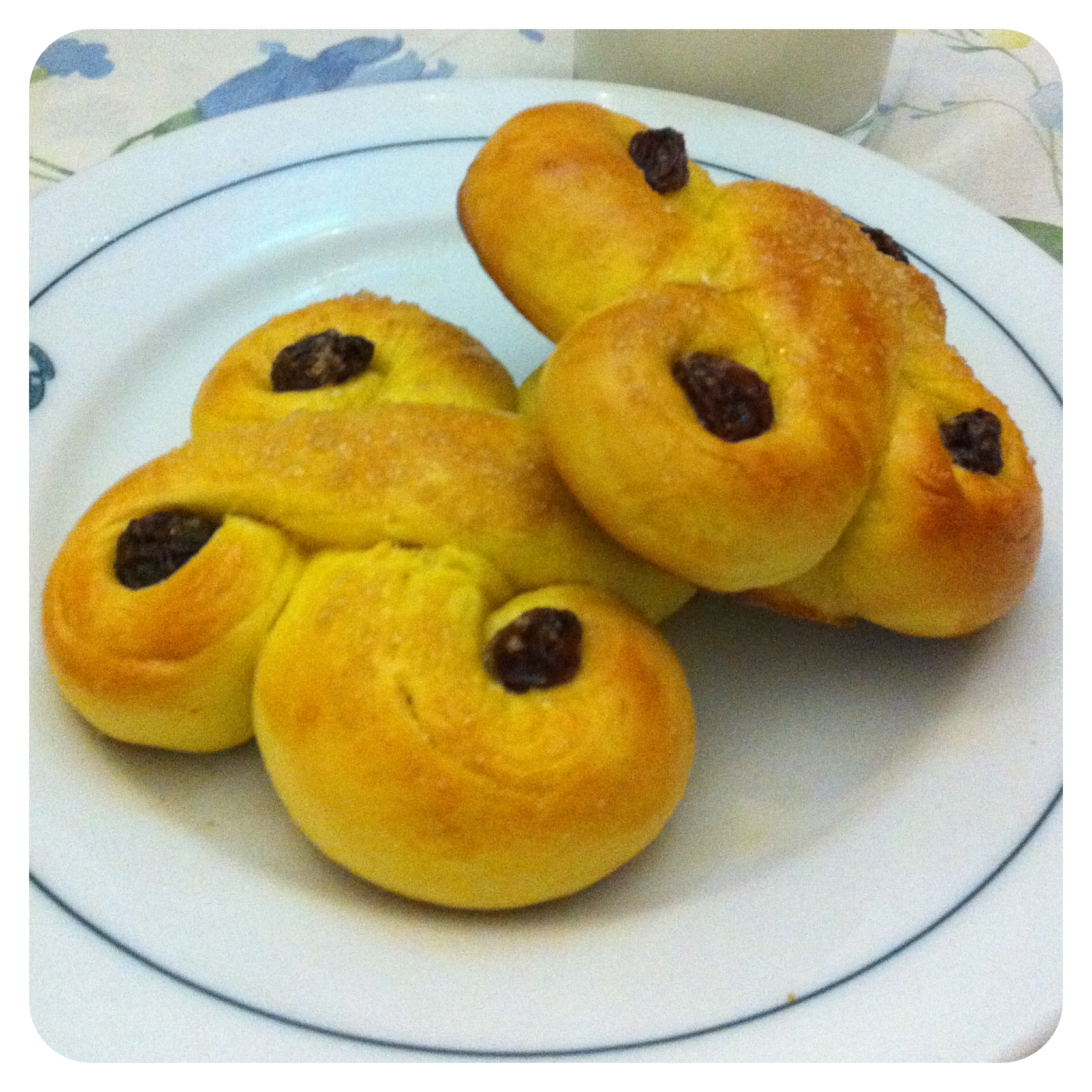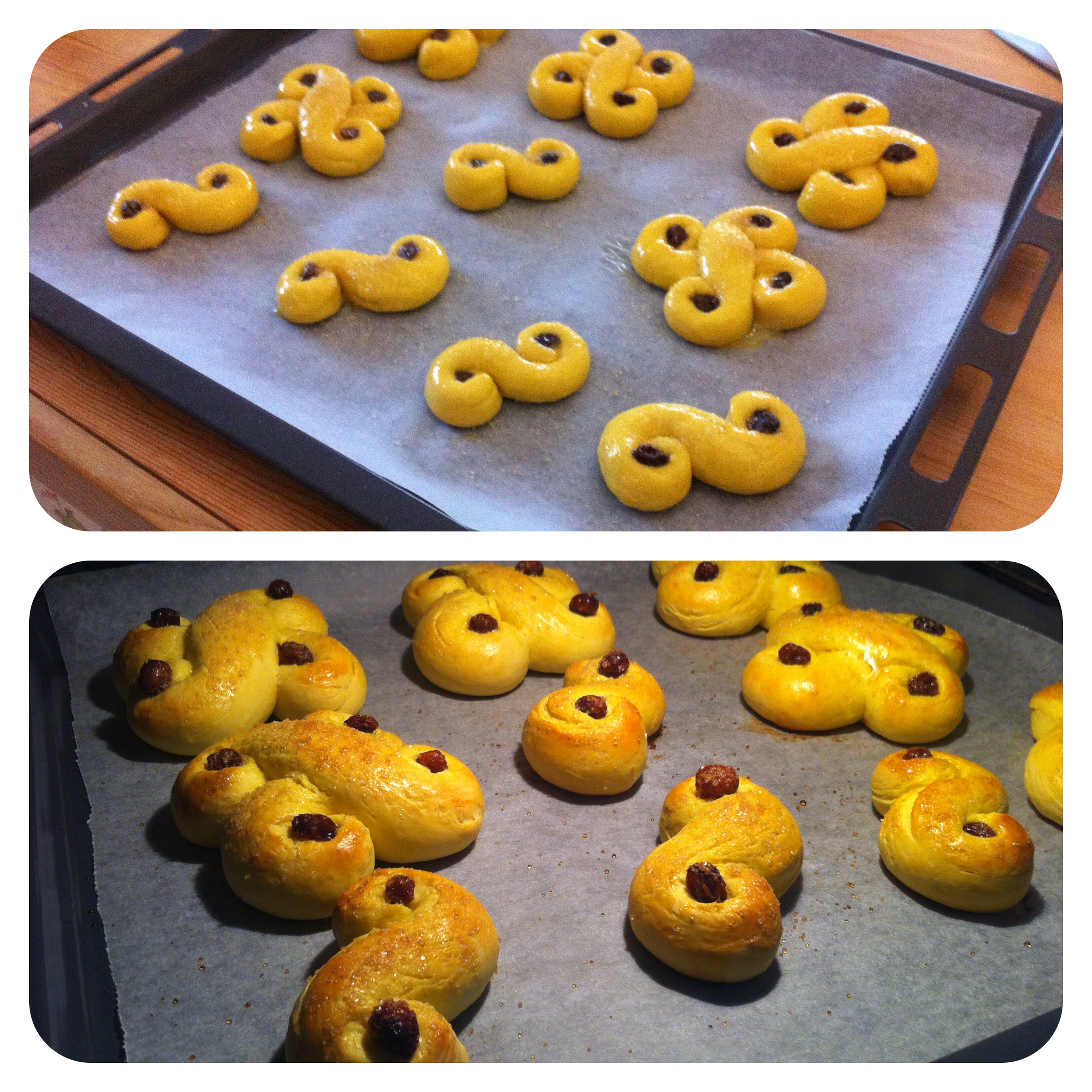 Una volta depositati in teglia li ho spennellati di uovo e (mia variante) aggiunto dello zucchero di canna in superficie. Questo in effetti non è proprio DOLCE, ho raddoppiato la dose di zucchero per renderlo meno neutro. Una possibile variante ulteriore è togliere lo zafferano e mettere un paio di tuorli nell’impasto, aggiungendo altro zucchero (non sarebbero più i Lussekatter però…).