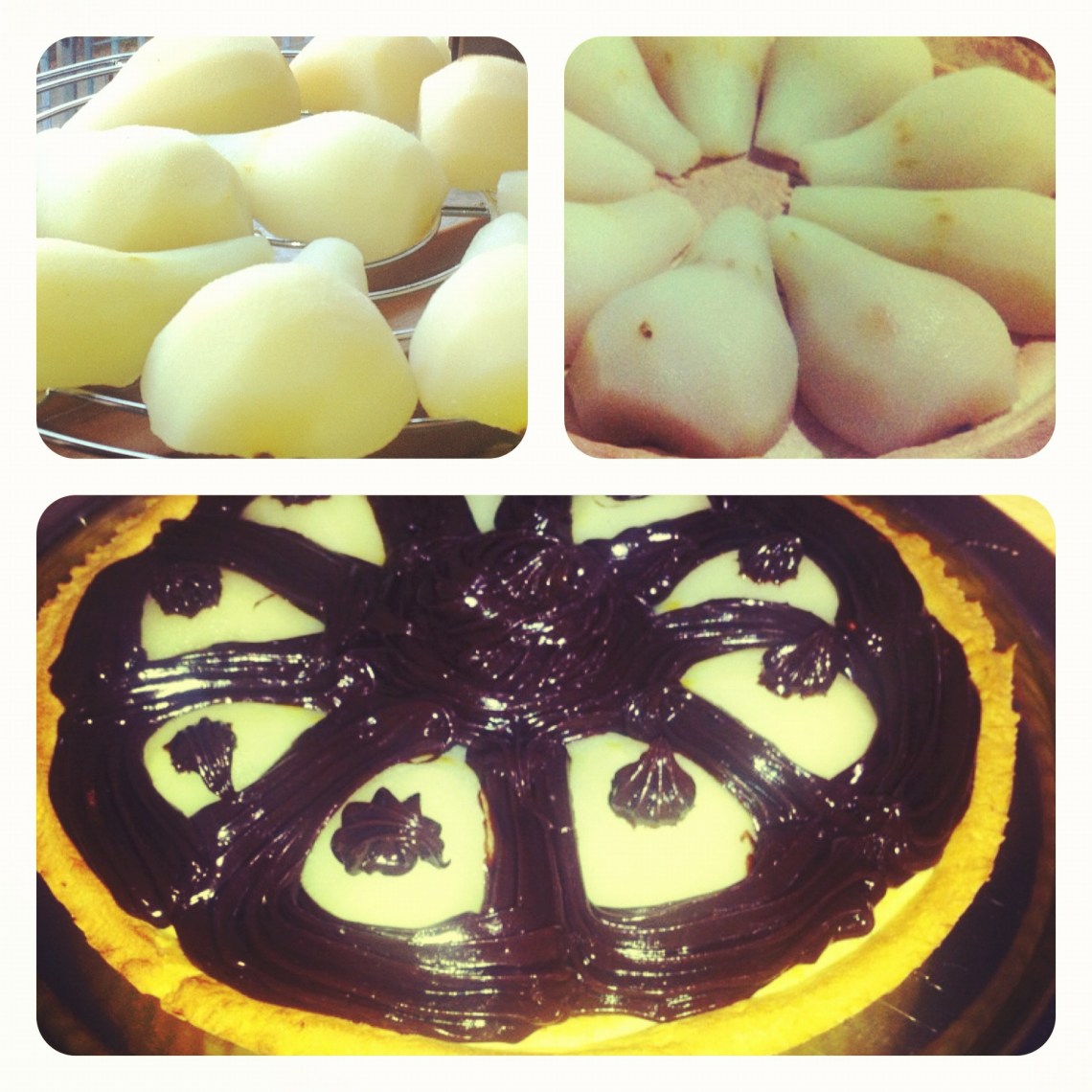 Prima di tutto sbucciamo le pere e priviamole dei semi tagliandole a metà. Quindi cuociamole in acqua bollente con zucchero, buccia d’arancia, succo di arancia, passito, una stecca di cannella e il baccello di vaniglia i cui semi avrete usato per la frolla (tenete sempre i baccelli della vaniglia, per queste cotture come per le bagne di pasticceria sono utilissimi). Una volta cotte le pere, scoliamole e facciamole raffreddare. Nel frattempo avremo steso e cotto a vuoto la frolla in una normale teglia per crostate con uno spessore di 6 o 7 mm e far raffreddare anch’essa. A parte tritare a coltello il cioccolato. Fonderlo a bagnomaria o in microonde e a freddo incorporarvi la panna liquida fredda con una frusta ottenendo una ganache morbida. Far raffreddare la ganache fino a poterla porre in frigo in modo che si solidifichi maggiormente. Quindi quando avrà una consistenza abbastanza densa, porla in sac à poche con bocchetta a stella e comporre la torta ponendo le mezze pere cotte su uno strato di marmellata di pere e decorando gli spazi vuoti tra esse con la ganache di cioccolato.