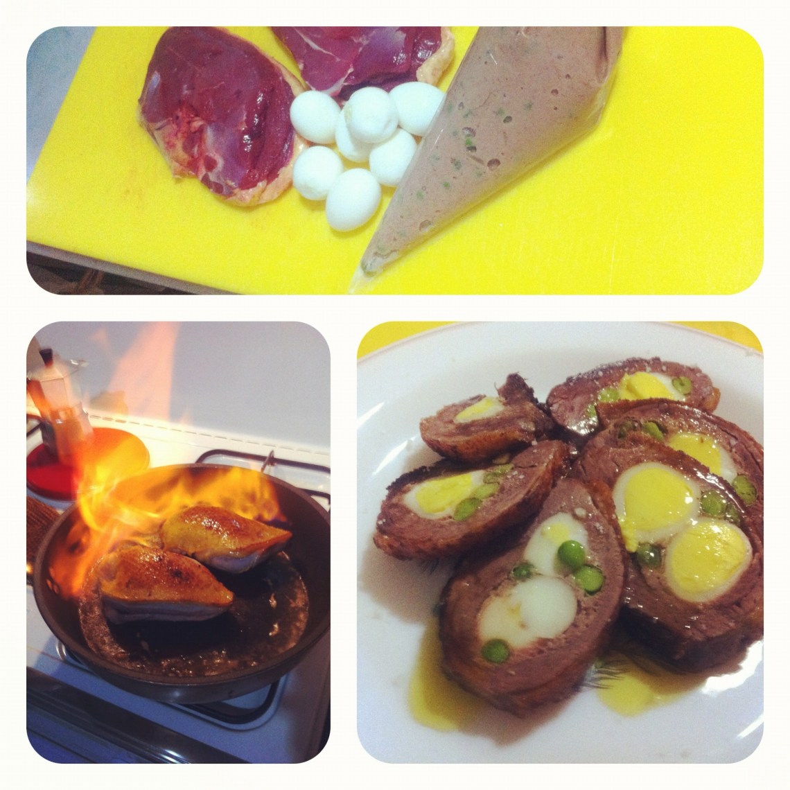 Prima di tutto sbollentate i piselli in abbondante acqua salata e farli raffreddare. Ottenere uova sode di quaglia facendole bollire 3-4 minuti in acqua bollente e sbucciarle tenendole ben intere. Quindi saltare in padella con dello scalogno i fegatini d’anatra e fiammeggiarli con del brandy aggiustando di sale. Quindi frullare e lasciar raffreddare. In una ciotola incorporiamo i piselli e l’albume alla purea di fegatini e poniamo in un sac à poche. Creiamo delle tasche nei petti d’anatra incidendo le due metà che formano il petto con un coltello sottile e ben affilato (coltello boucher) riempiamo la tasca con la crema di fegato ai piselli mettendo qua e la delle uova sode di quaglia. Chiudete con ago e filo (o con uno spiedino di legno) l’apertura. Sigillate i petti in padella antiaderente, fiammeggiateli con del brandy e terminate la cottura a 180°C in forno, tenendo i petti bagnati con brodo vegetale fino ad avere una temperatura al cuore di 70°C. Estrarre dal forno e lasciar riposare alcuni minuti per far rassodare il tutto e ottenere fette di arrosto che non si disfino. Servire con il suo “sugo” di arrosto.