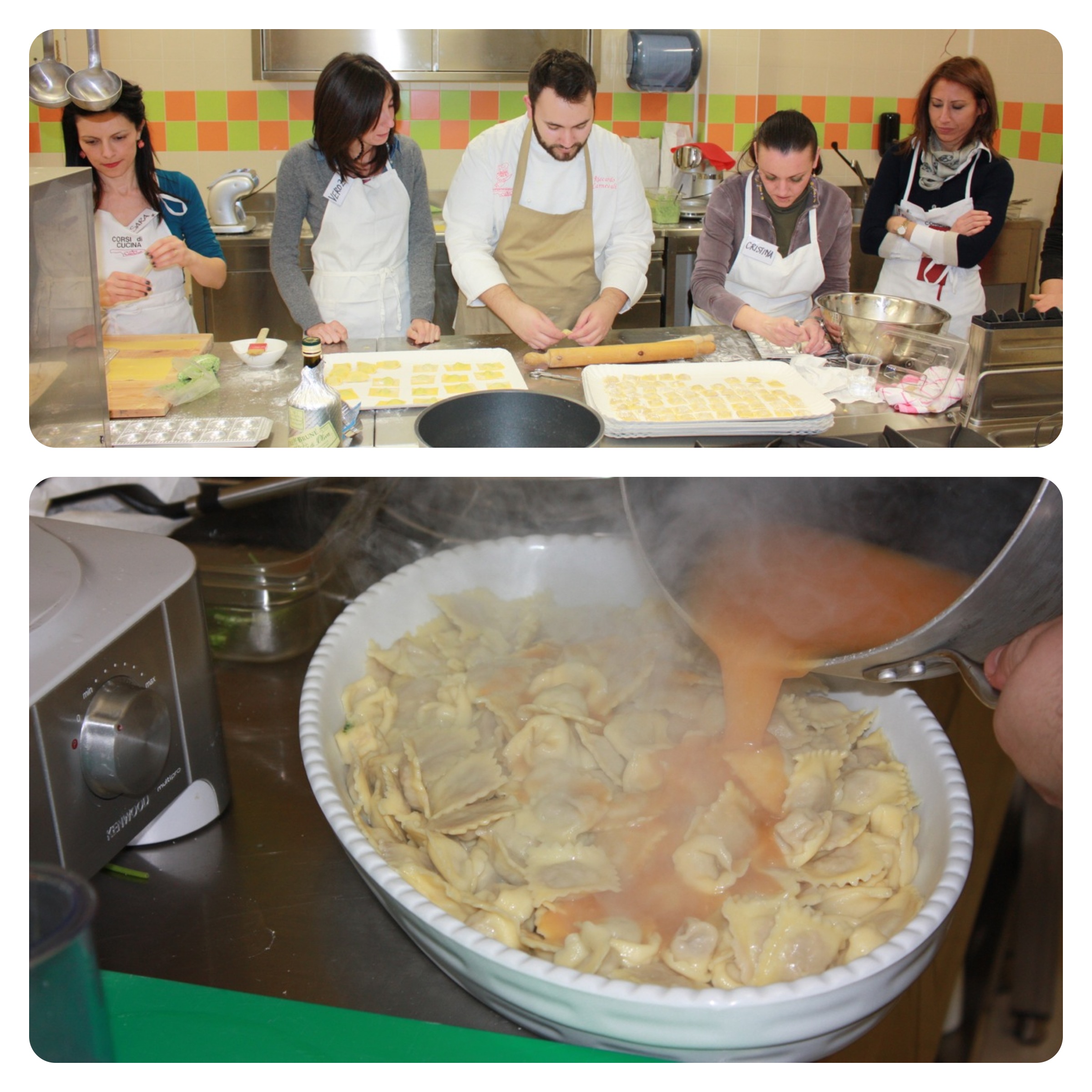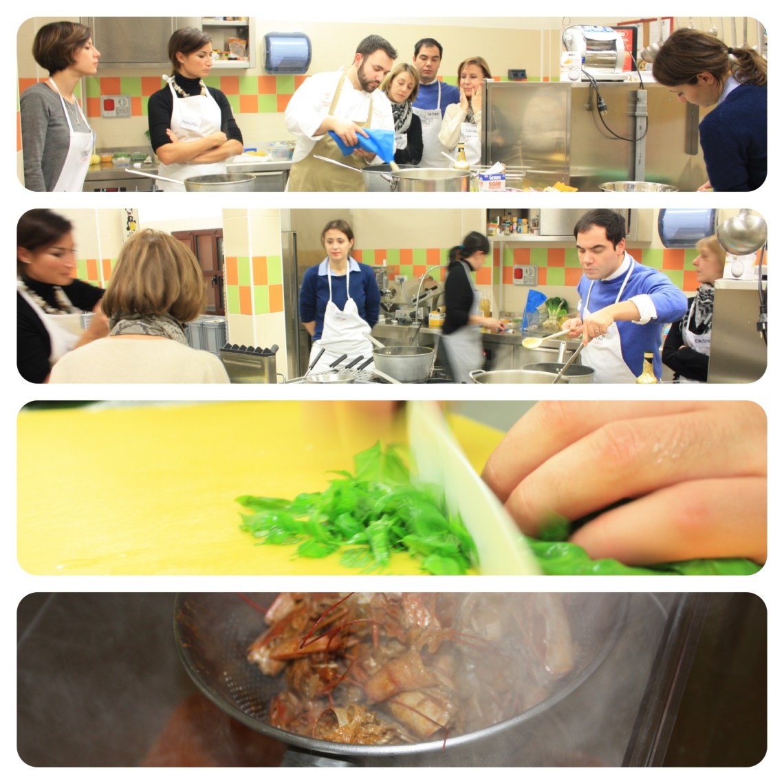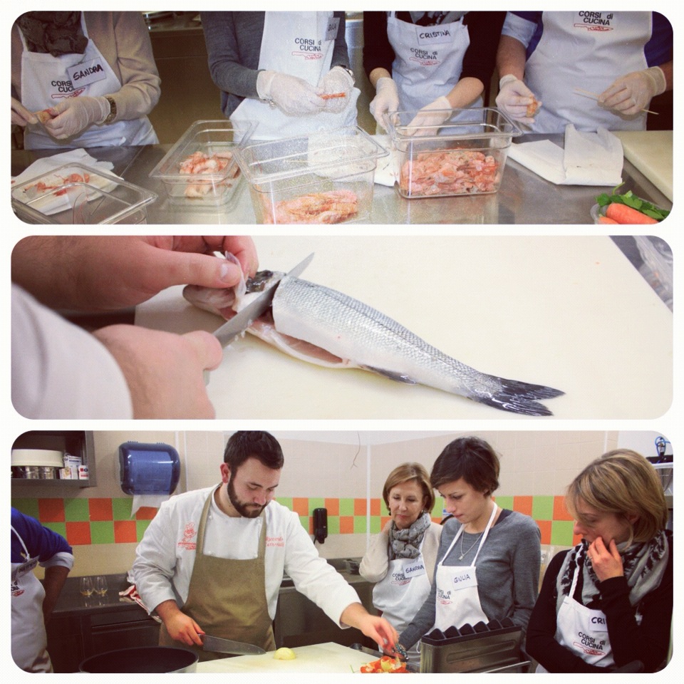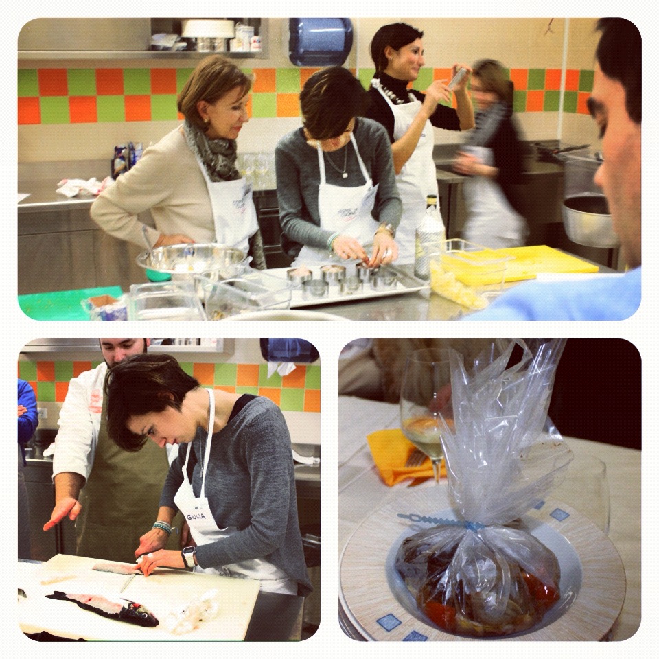 Proseguono i miei corsi di cucina… (corsi che credo non avranno più fine dato il grande successo che riscuotono), questa settimana abbiamo fatto pasta ripiena 1 e 2 e “a panino” nel mezzo, abbiamo affrontato una serata di pesce facile e veloce! In pasta ripiena 1 abbiamo fatto ripieno di arrosto e mortadella e ripieno di magro (ricotta e spinaci) con varie chiusure diverse. In pasta ripiena 2 invece abbiamo fatto un ripieno al salmone e uno con sola mortadella, cremosa, profumata… Mercoledì abbiamo poi affrontato i fondamentali sul pesce, con cartoccio, risotto, bisque, sformatino… il tutto partendo dal pesce acquistato, pulendo, sfilettando, ecc ecc. Le ore passano velocemente, le sessioni sono sempre molto intense e tutti lavorano in prima persona sotto il mio controllo. Il tutto parte con un aperitivo di benvenuto in cui offro ai corsisti fingerfood e affettato, con un calice di bollicine, nel frattempo illustro cosa andremo a trattare durante la serata.