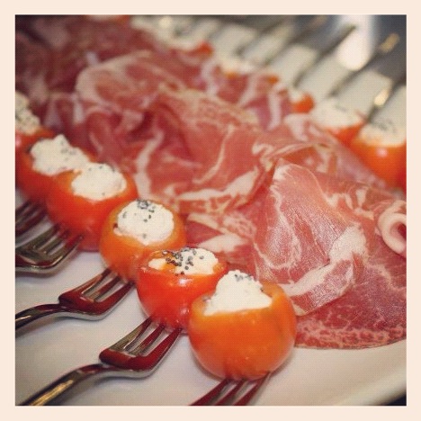 aperitivo con pomodorini datterino ripieni di ricotta alle erbe e coppa stagionata ☟