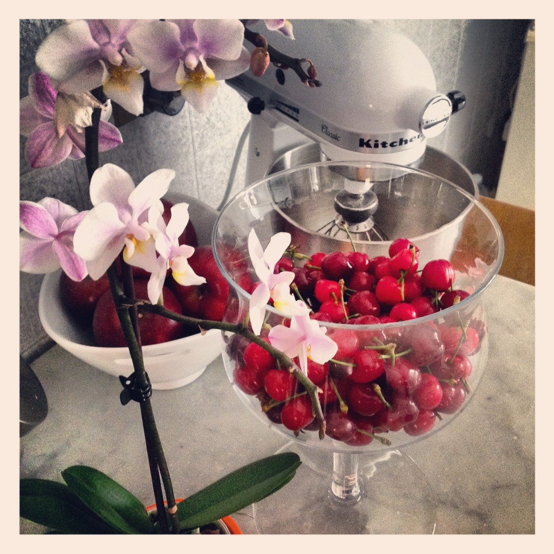 Come si può resistere alla tentazione di comprare tonnellate di fragole e ciliegie?!? Soprattutto dopo un inverno infinito, la frutta di primavera è per i cuochi, quello che le rondini sono per i contadini… La cosa che volevo assolutamente evitare era far diventare questa frutta una normale guarnizione. Volevo che ciliegie e fragole fossero l’ingrediente principale del dolce e non solo l’aroma o l’aggiunta.