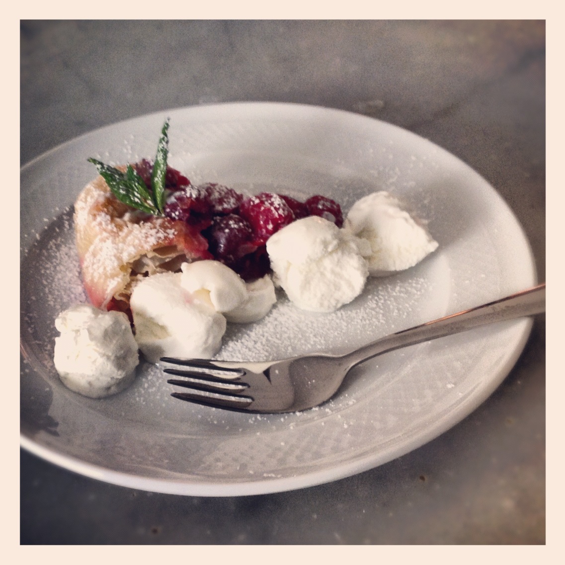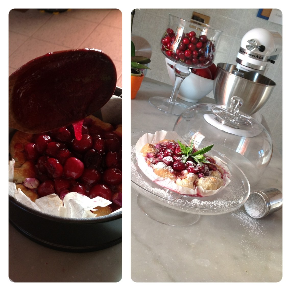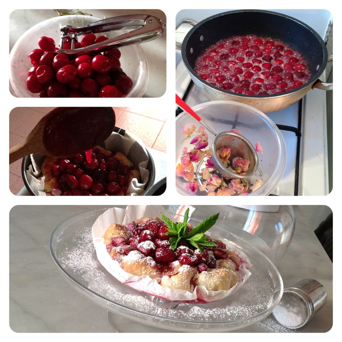 Si caramella lo zucchero con poca acqua (io ho messo a bagno in quest’acqua delle rose essiccate, si aggiunge poi una noce di burro ele ciliegie denocciolate, e si fa cuocere il tutto una decina di minuti. Nel frattempo si precuoce la sfoglia in una tortiera foderata di carta forno. Quando la sfoglia inizia ad “arrossire” aggiungere le ciliegie caramellate e finire 5 minuti in forno. Far raffreddare e spolverare di zucchero a velo. Consumare con palline di gelato alla panna. (P.S. è una torta da consumarsi alla svelta altrimenti la sfoglia si bagna troppo!)