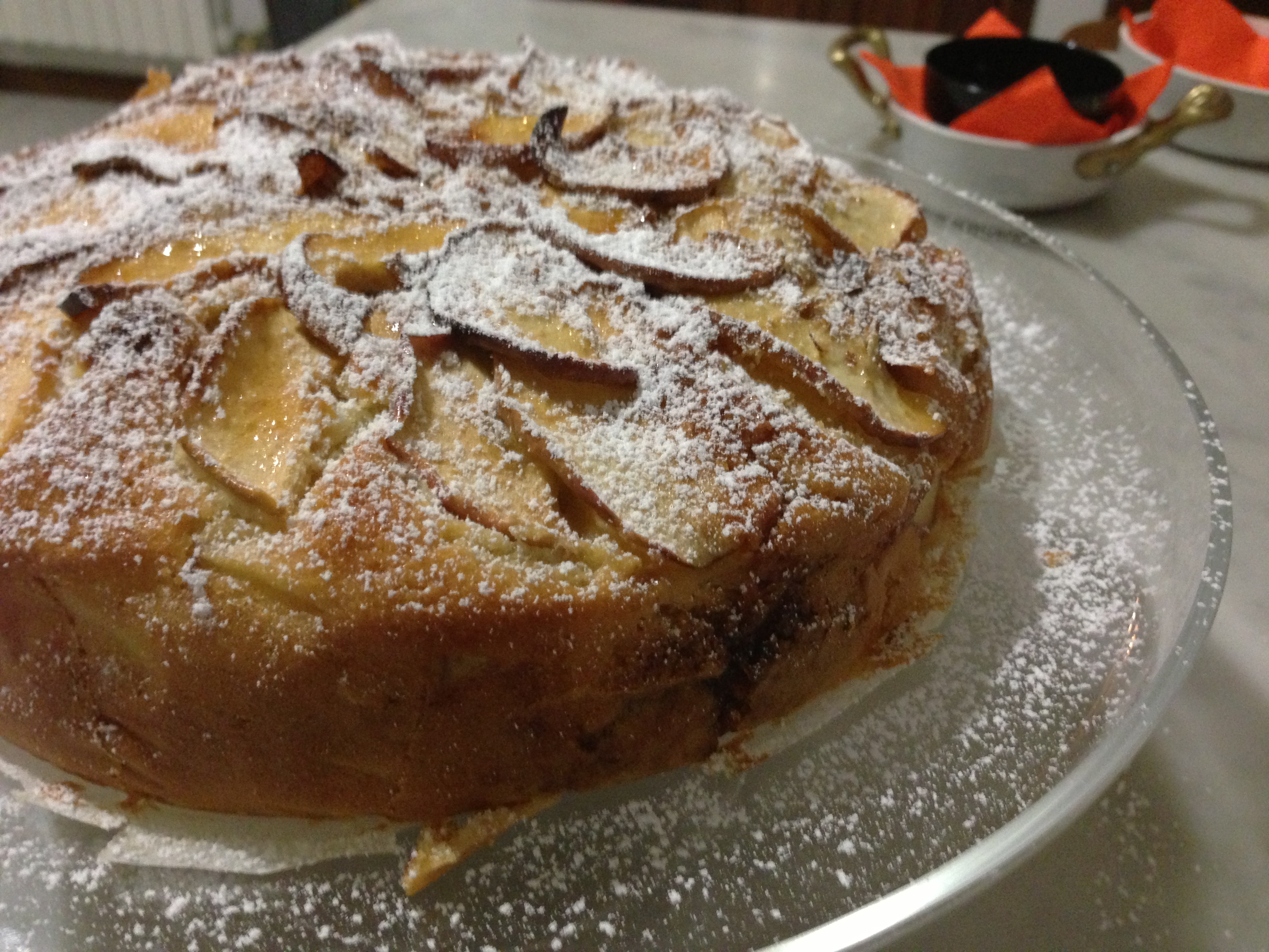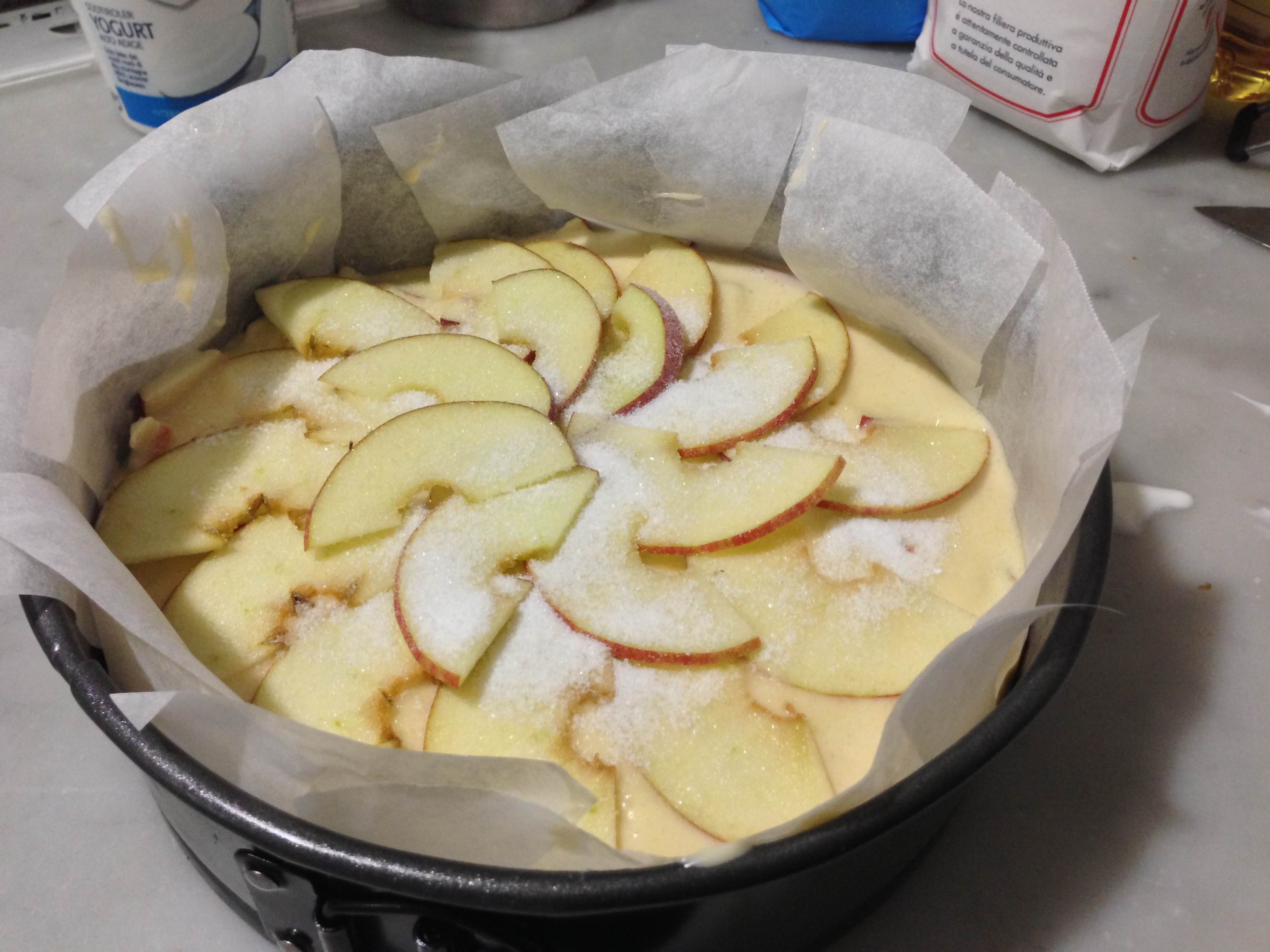 Frustate 2 uova con un vasetto di zucchero, quindi, mettete la planetaria al minimo e incorporate lo yogurt che era nel vasetto e 3/4 di vasetto di olio di semi di girasole, quindi incorporate 3 vasetti di farina 00 setacciata con mezza bustina di lievito vanigliato. A parte tagliate a fettine sottili 2 mele tagliate a metà e detorsolate, tenendo da parte qualche fettina per decorare la superficie (da spolverare poi con zucchero che caramellerà). Incorporate al composto le mele a lamelle e versate in tortiera foderata di carta forno. Infornate a 200°C per 30 min circa (forno ventilato).