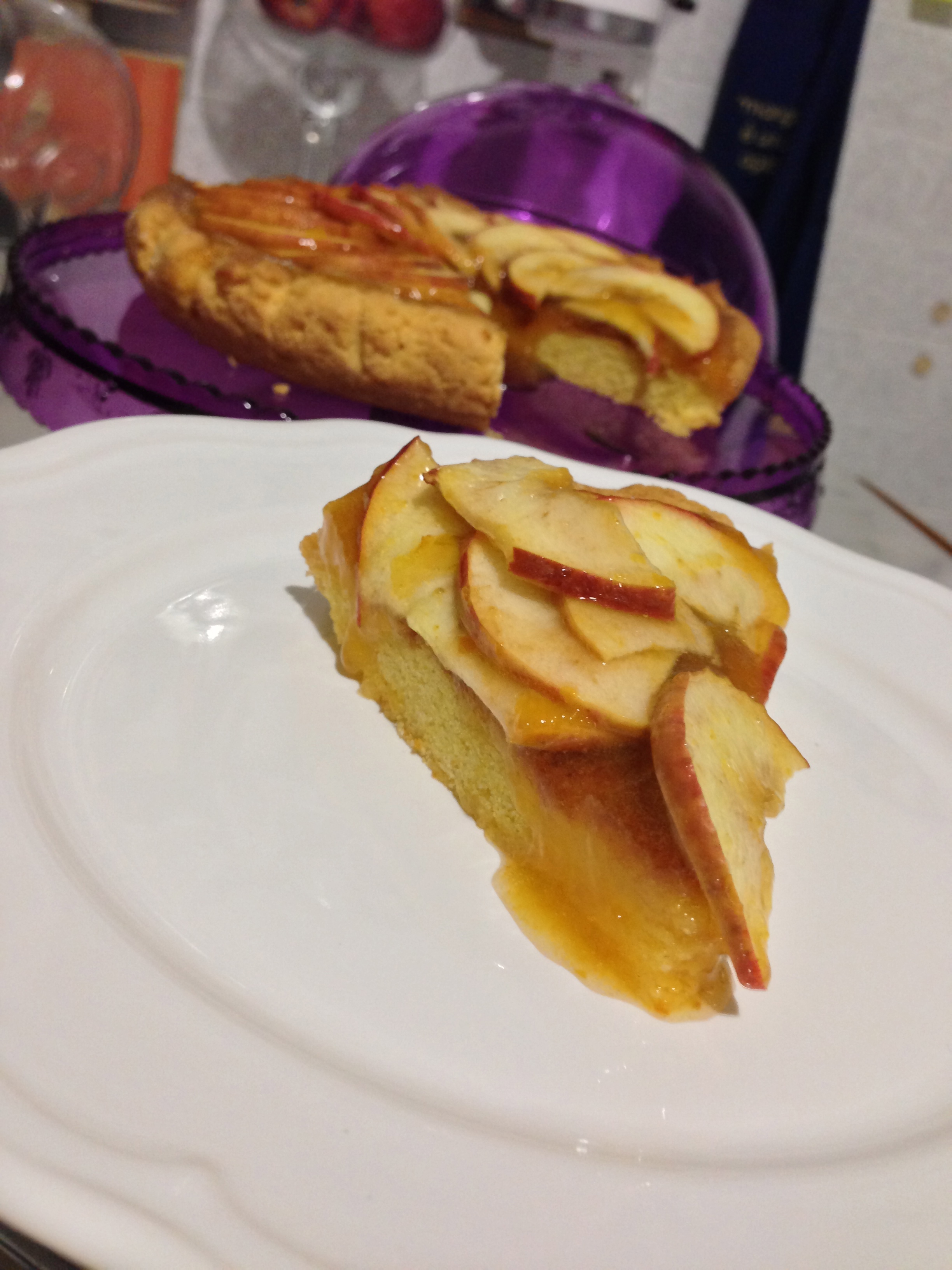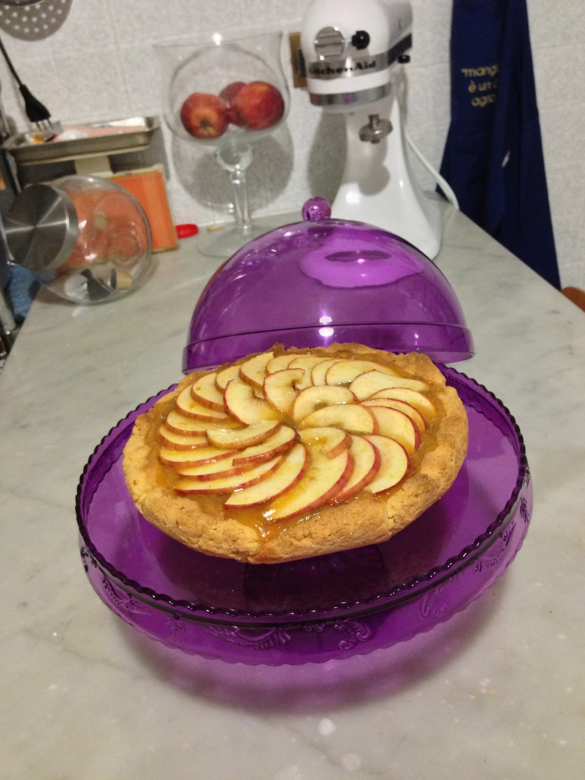 Oggi dopo aver fatto una precottura di 20 – 25 min. della sola base di frolla, ho poi ricoperto la superficie con 0,5 cm di confettura d’albicocca, mele a lamelle spennellate di marmellata frullata con poca acqua e in fine spolverate con zucchero semolato; passando poi il tutto in forno per altri 15 min.