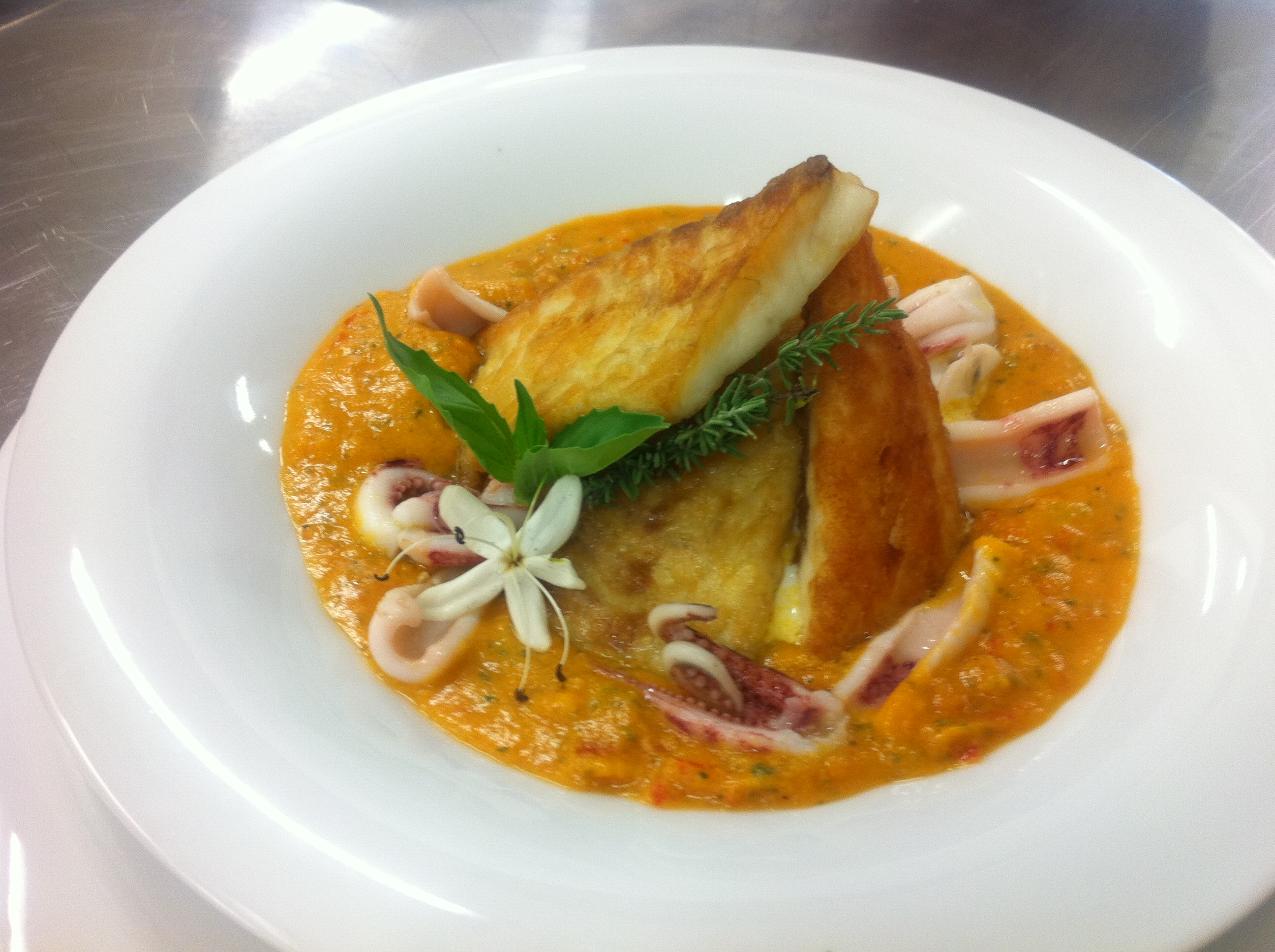 Ricetta davvero sfiziosa per l’estate… con le melanzane e i pomodori che diventano crema su cui posare calamaretti appena scottati in olio e succo d’arancia e filetti di pesce (branzino ad es.) rosolati velocemente in padella…