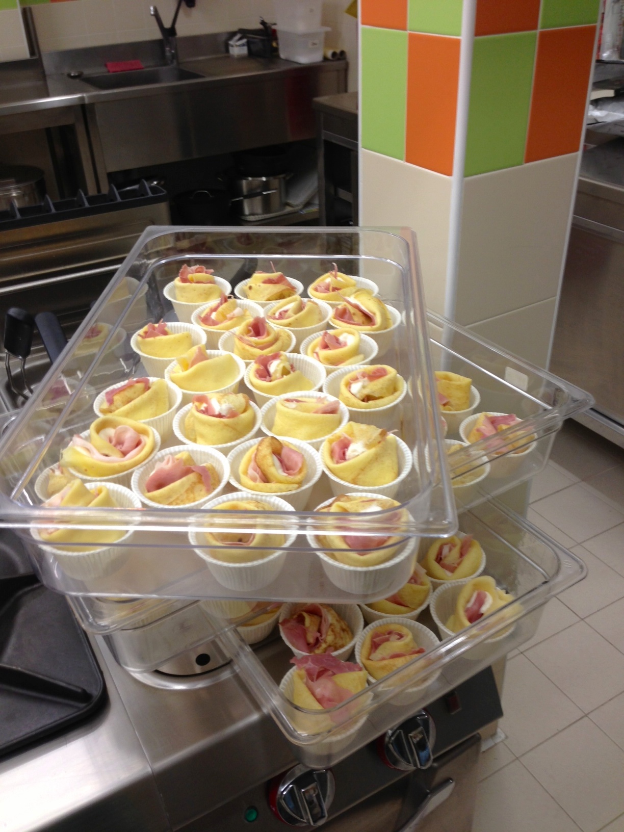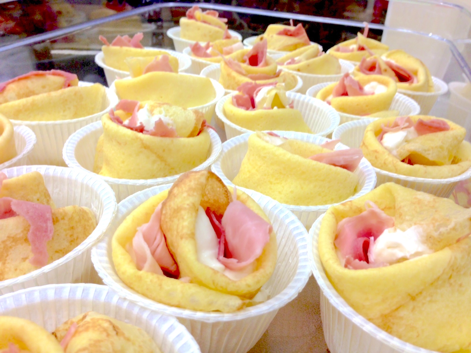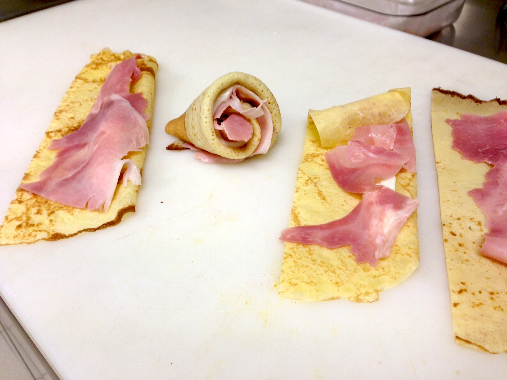 Per completare l’opera (oltre alle decine o centinaia di possibilità di farciture) vi mostro questa farcitura con chiusura “a rosa”. Qui vedete la monoporzione che uso nei miei buffet, ma nessuno vi vieta di posarli su un bel letto di besciamella con verdura frullata a piacere o salsa di pomodoro e gratinarli tutti attaccati.