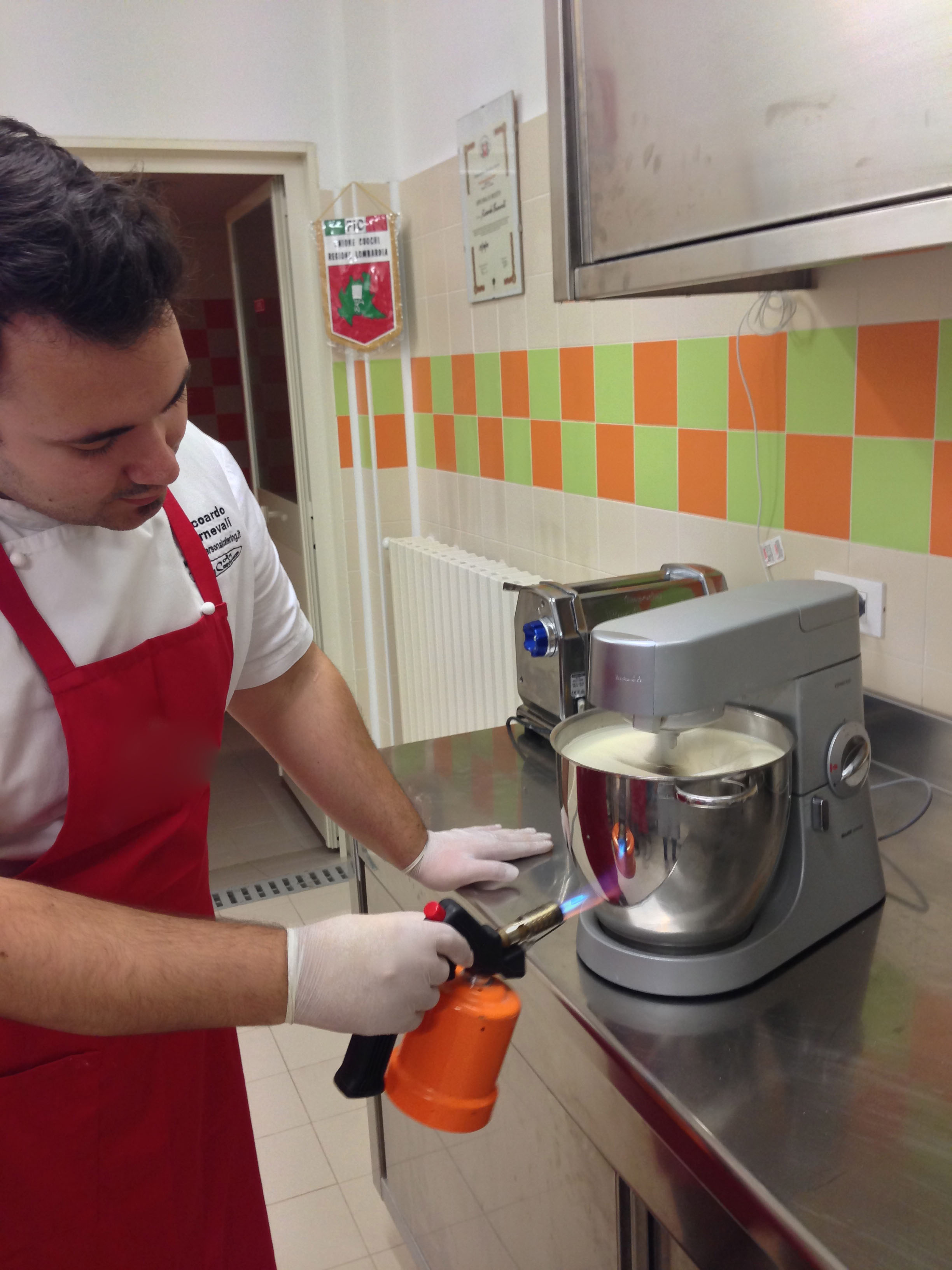 - Sbattere a lungo le uova con lo zucchero affinchè il composto si gonfi parecchio e dal classico giallo arrivi ad un bianco/rosa tenue (io scaldo il secchiello della planetaria col cannello in modo da portare le uova dalla temperatura di refrigerazione ai 15-18°C, ovvero la temperatura ideale delle uova per incorporare aria.
