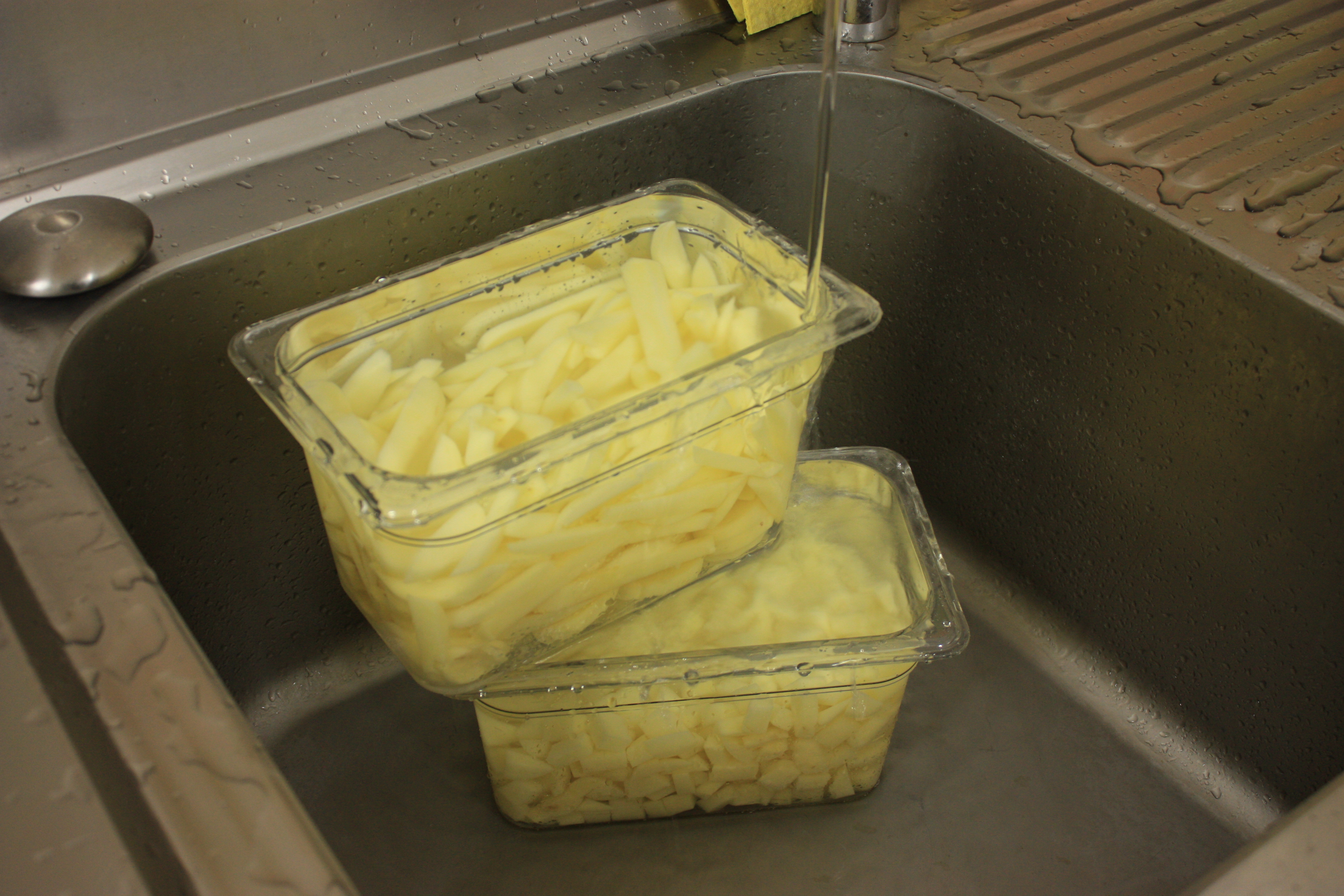 Invece di sbollentare le patate, eliminiamo buona parte del loro amido, tenendole a bagno in acqua con ricircolo costante per 20 min. / mezz’ora. L’acqua da torbida diventerà limpida. A quel punto scolatele bene e asciugatele un po’ con un canovaccio pulito. In questo modo, le patate risulteranno meno “gommose” e collose e tenderanno meno ad attaccarsi fra loro in cottura.