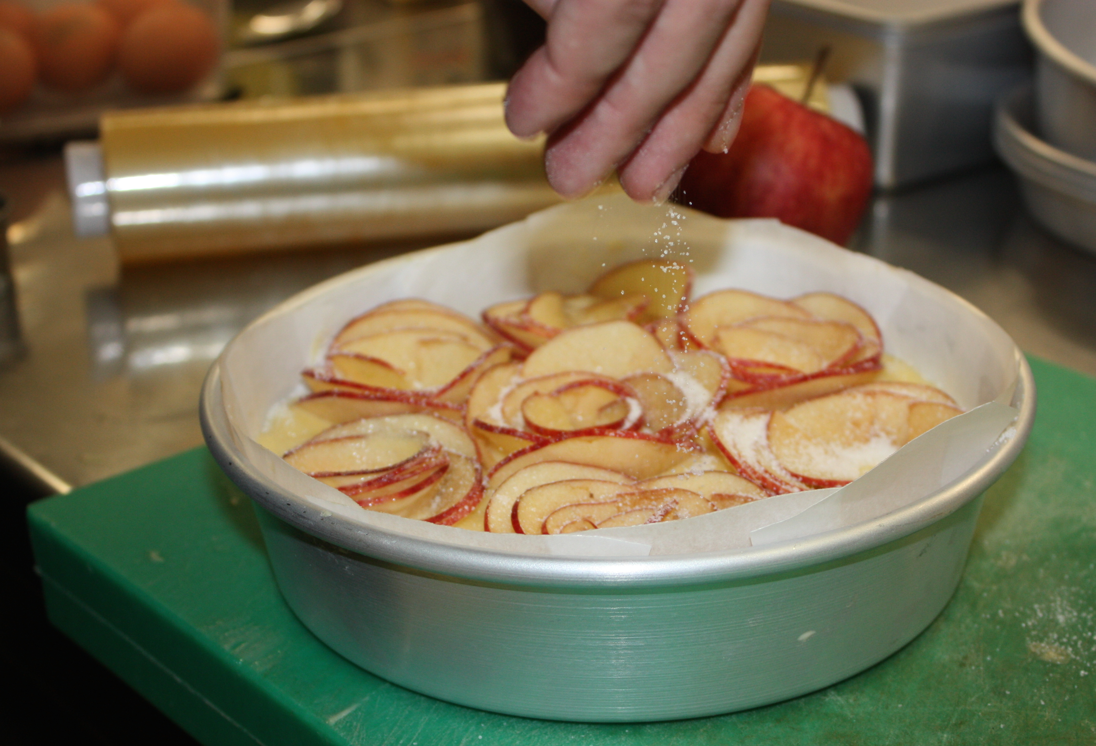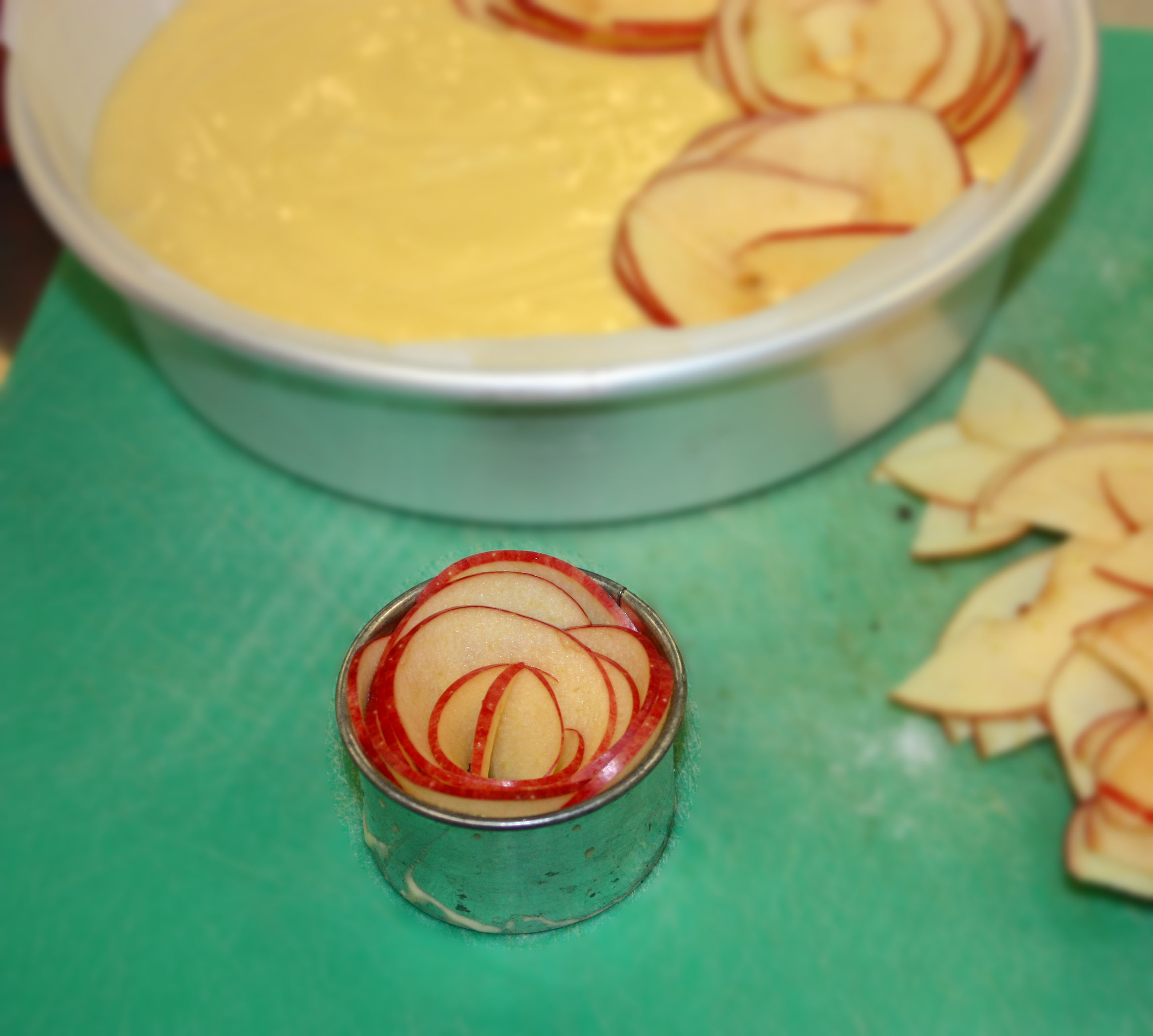 Se invece di mettere le lamelle nel composto, volete complicarvi la vita, dopo averla privata del torsolo, tagliate la mela a metà. Affettatela sottilissima con la mandolina. Quindi, aiutandovi con un coppa pasta, create i vostri strati di “petali di mela” a cerchi da 3 fette alternate. Quindi, reggendone la base, posatela sulla torta e fate scivolare sulla superficie la composizione, andando poi ad aprire il vostro fiore di fette di mela.