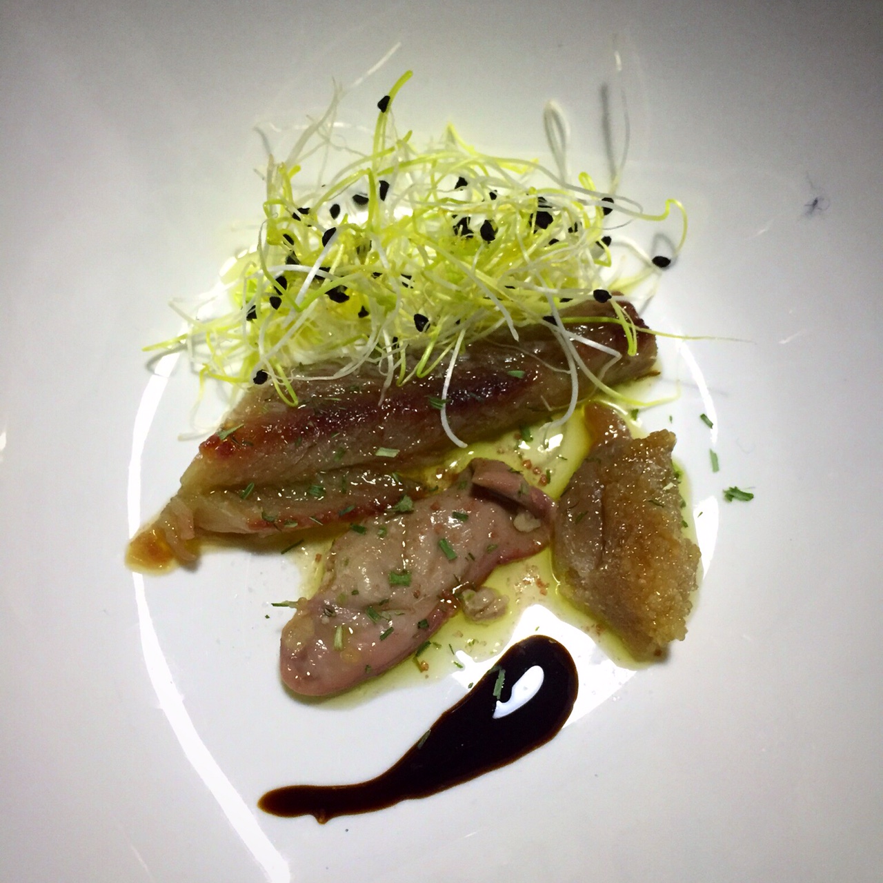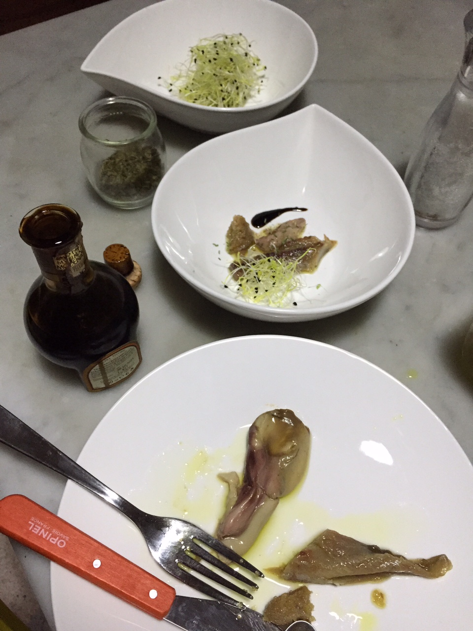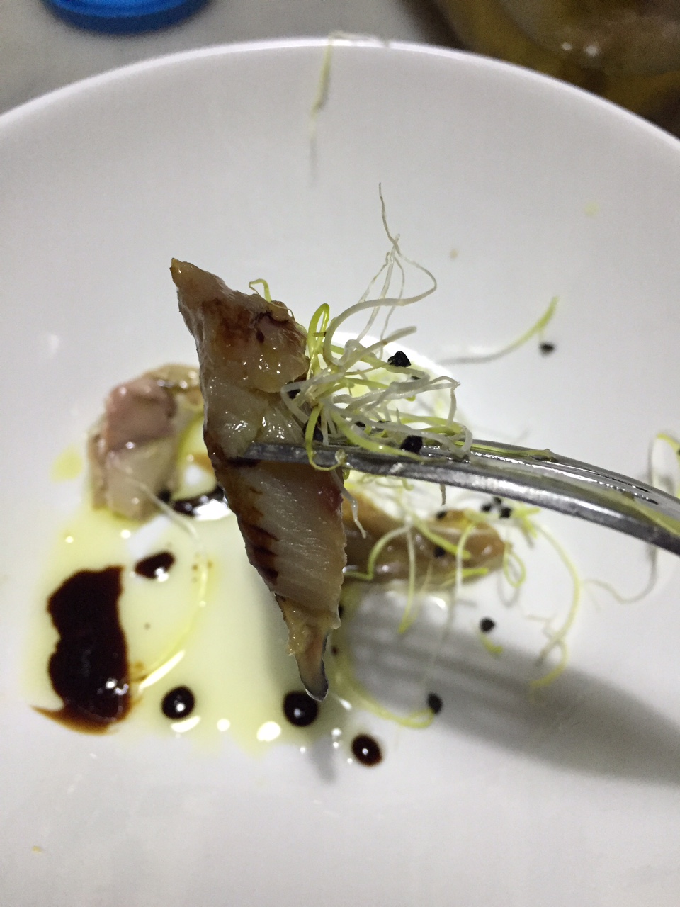 Qui sotto la vedete dopo giorni di “maturazione” in olio, aglio ed alloro, messa nel piatto… filetto, fegato e uova di aringa affumicata presentata con germogli di porro, aglio orsino e aceto balsamico di 30 anni.