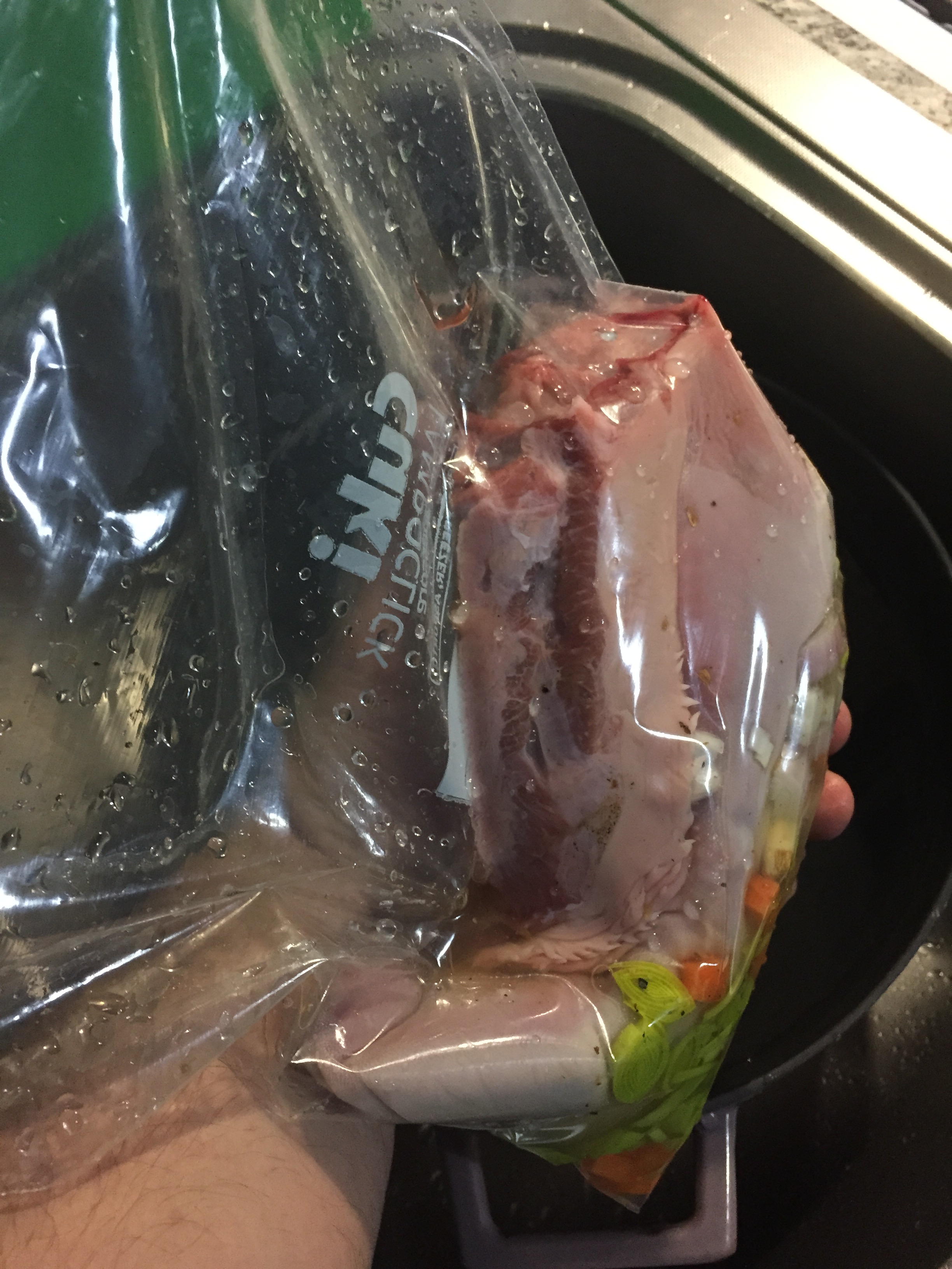 Per creare un idea di sottovuoto, non tanto per diminuire il rilascio di liquidi, quanto per questioni di spazio risparmiato, ho immerso in una vaschetta il sacchetto chiuso al 90% facendo fuoriuscire l’aria usando la pressione dell’acqua. Basta immergere tutto il sacchetto, lasciando la poca apertura fuori dall’acqua e appiattendo il sacchetto a mano. Poi si chiude velocemente l’ultimo lembo lasciato aperto e il “sottovuoto” rudimentale è fatto.