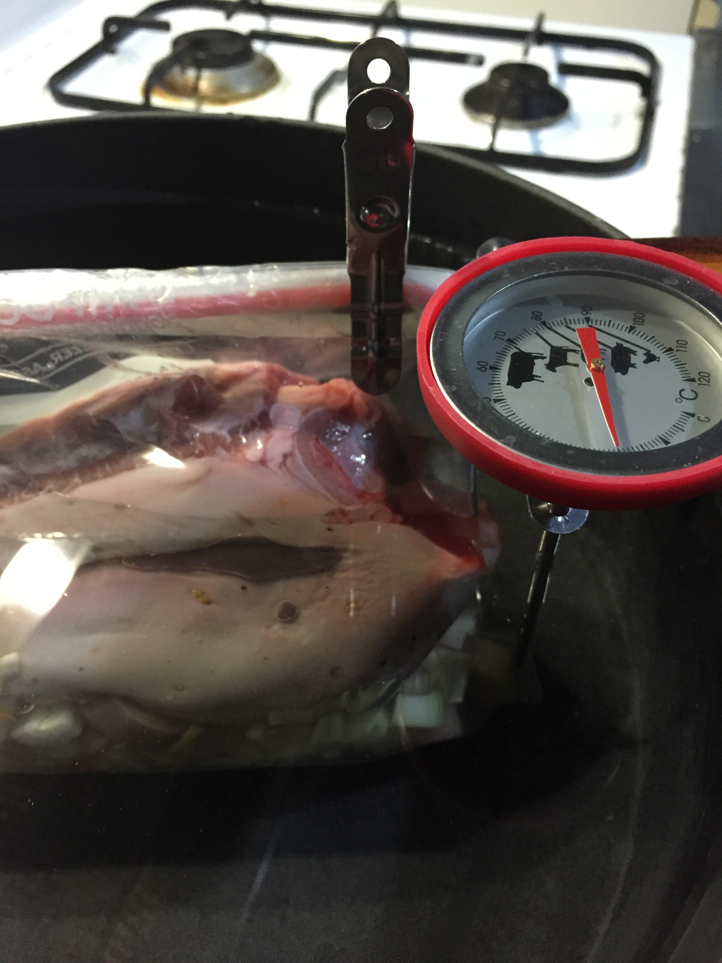 Quindi fissato il sacchetto all’asticella con due mollette ho immerso la lingua che naturalmente all’inizio abbasserà la temperatura dell’acqua, lasciandola un po’ a fiamma vivace sono tornato velocemente ai 75°C. Per controllare costantemente la temperatura ho posizionato una normalissima sonda analogica accanto alla lingua, puntata a misurare l’acqua (non si deve assolutamente infilzare il sacchetto per ovvie ragioni).