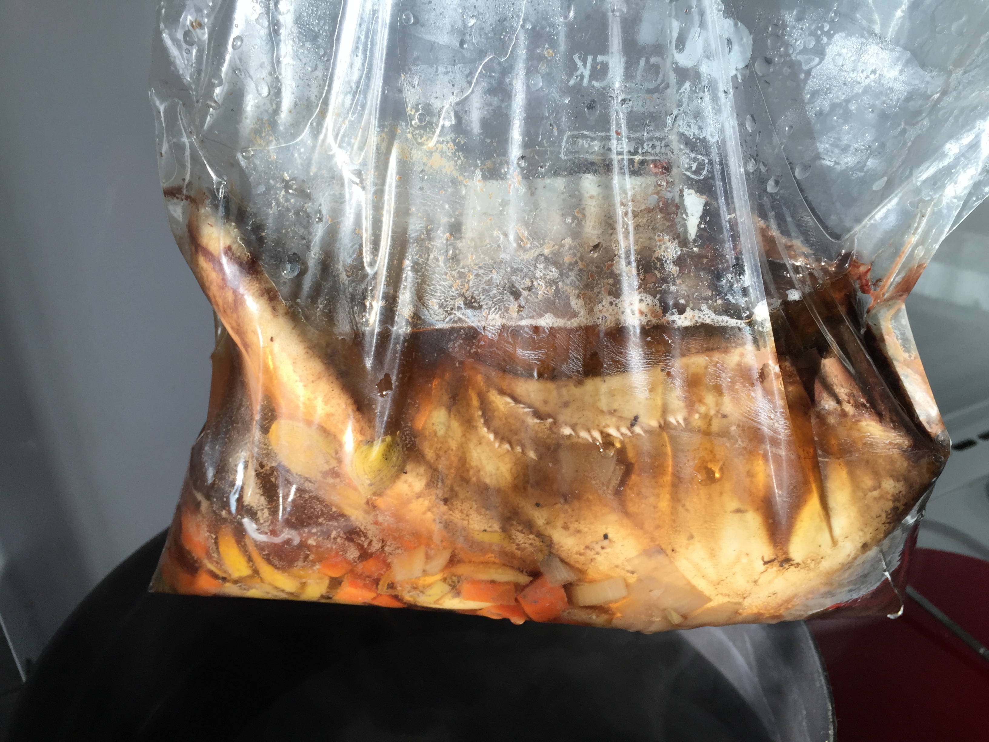Ho messo tutti gli ingredienti nel sacchetto a chiusura ermetica. Naturalmente non è un sacchetto creato per la cottura, ma data la bassa temperatura a cui sarà esposto e al fatto che sarà sospeso in acqua senza toccare il tegame, non dovremmo avere problemi.