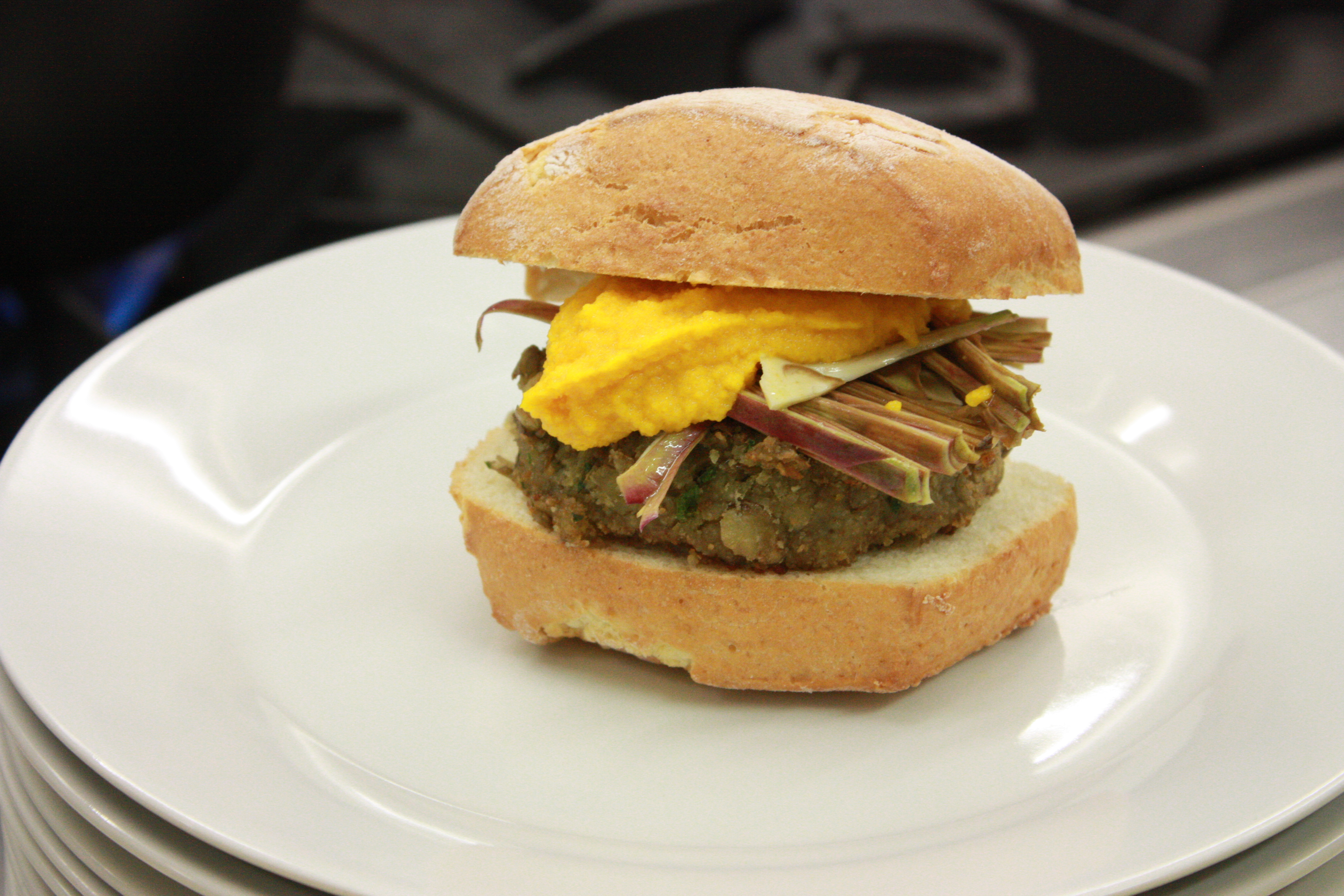 In questa preparazione ho abbinato l’hamburger a carciofi marinati in succo di limone e sale, e ketchup di carote.
