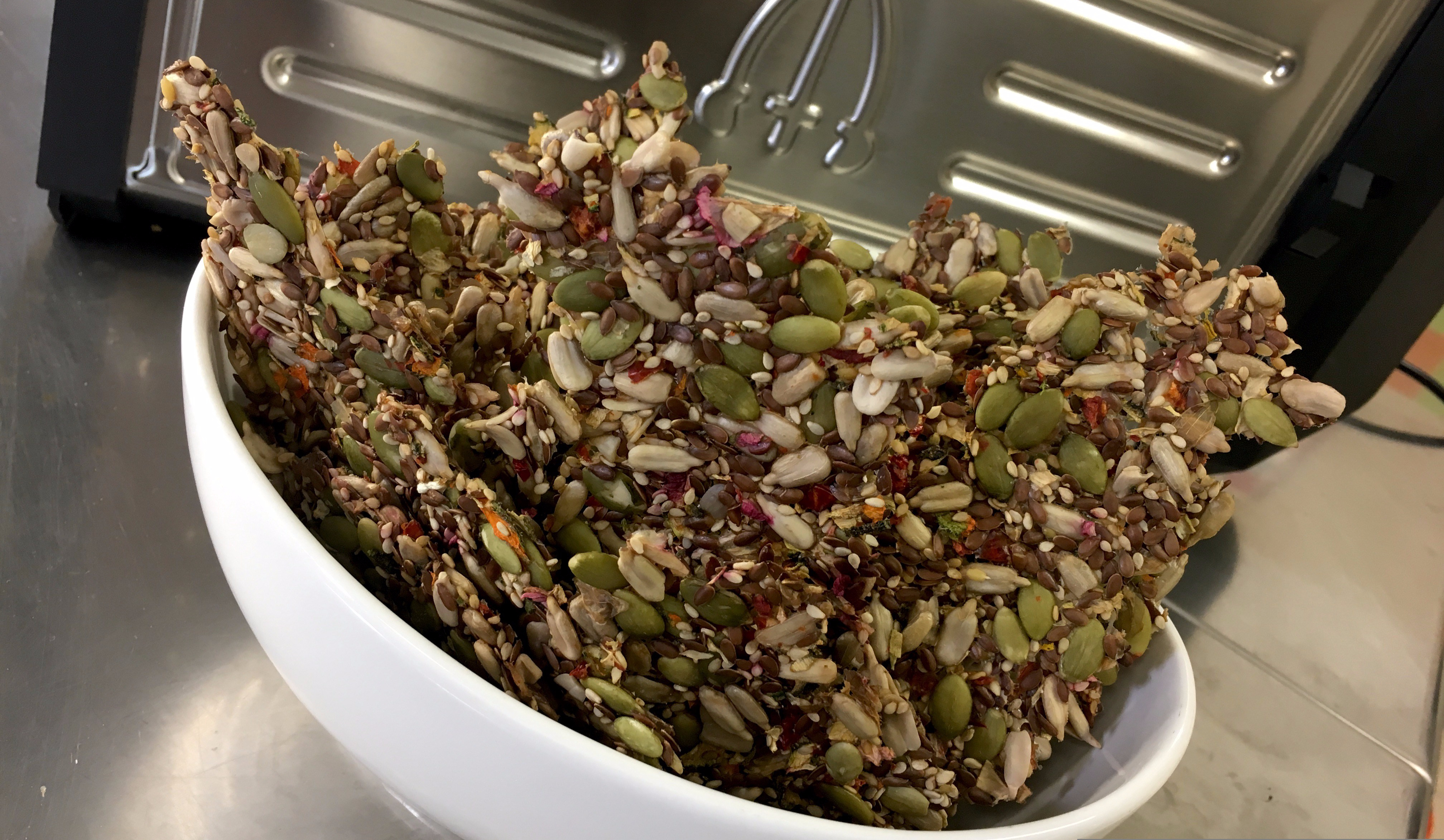 Ammollare alcune ore i semi facendo assorbire l’acqua e producendo una gelatina che aiuterà a legare assieme le componenti ottenendo i “cracker”.
