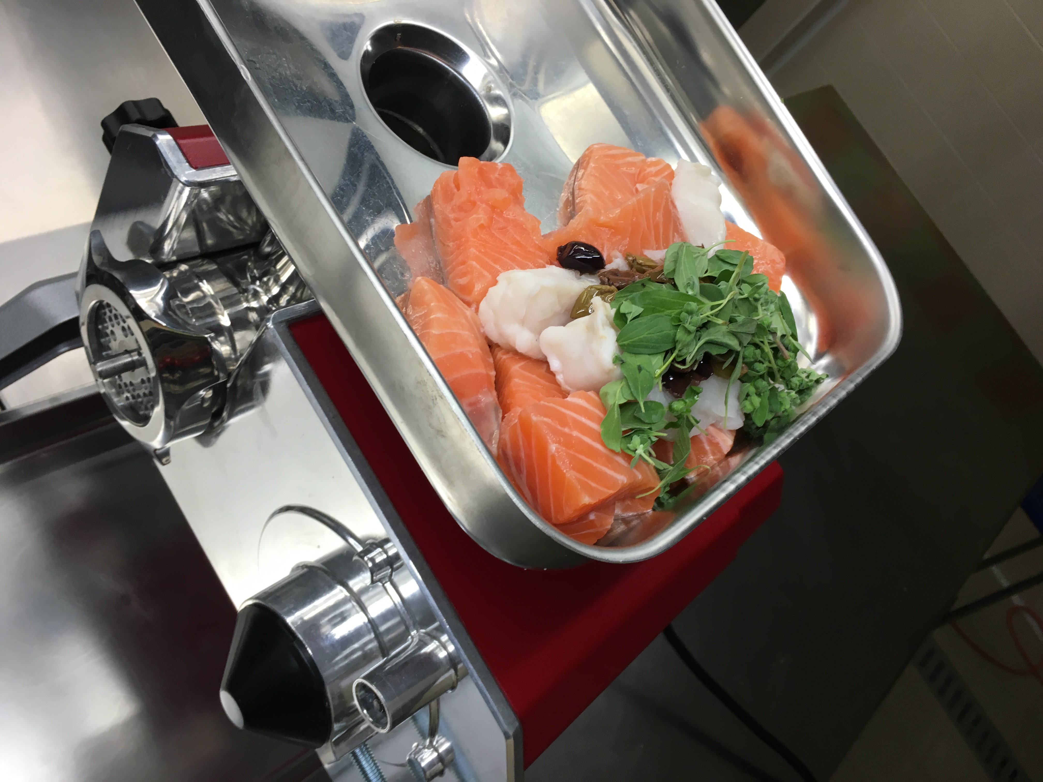 Tritare salmone, merluzzo, olive e maggiorana al tritacarne Toolio® con piastra a fori fini. Amalgamare con la quinoa cotta e condire con sale, pepe, olio e coriandolo (i semi essiccati di coriandolo, una volta macinati rilasciano un piacevole profumo agrumato).