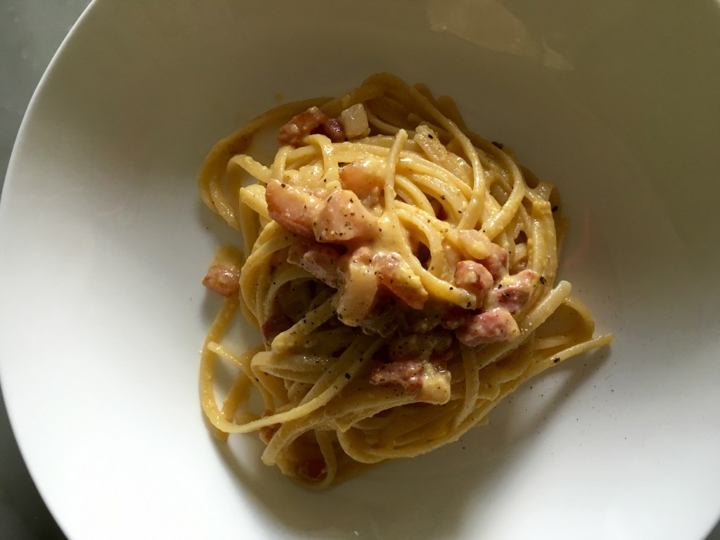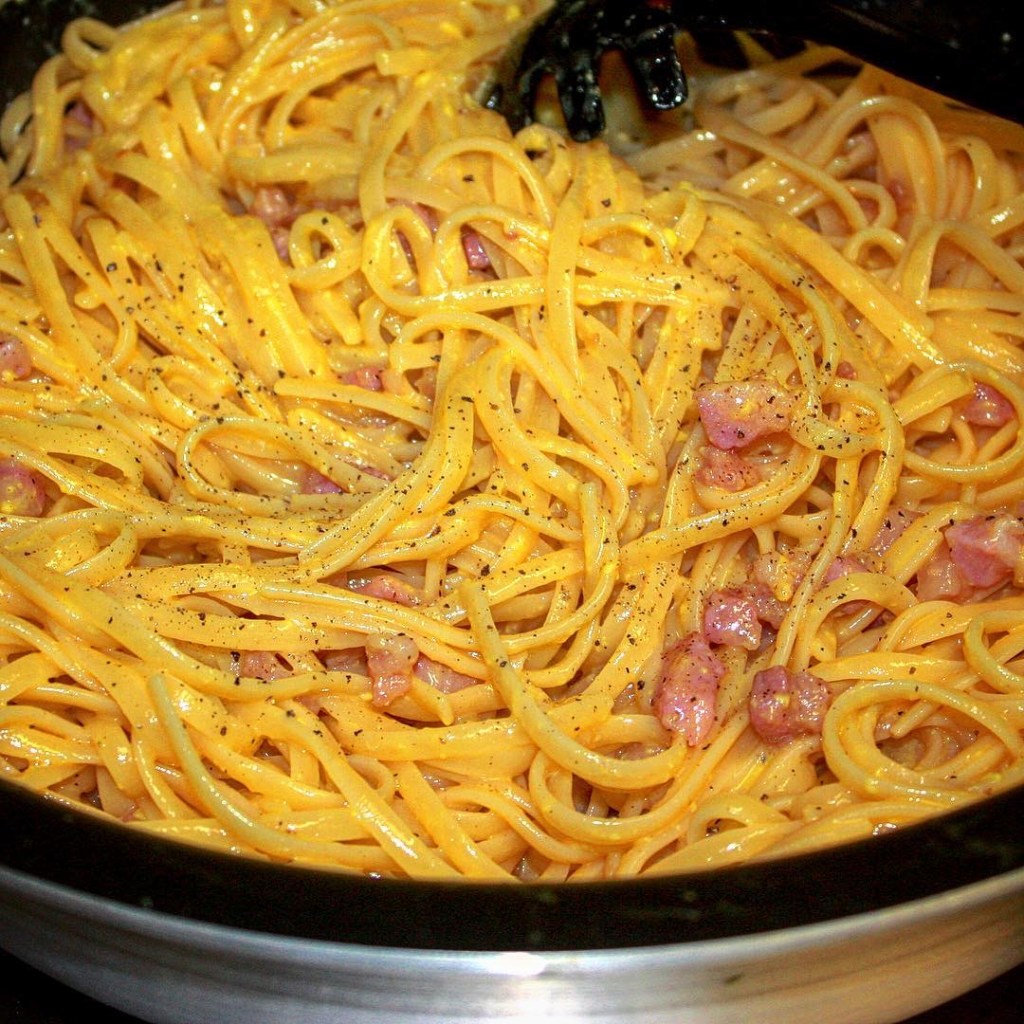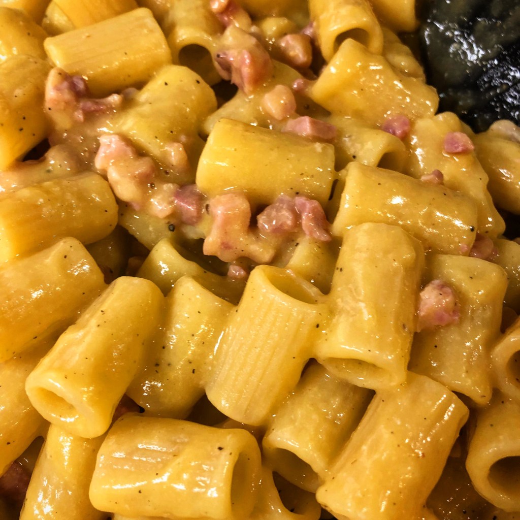 - Carbonara: una gricia che incontra l’uovo! Questa è la più difficile di tutte. Niente panna né latte o vi tolgo il saluto!! Guanciale arrostito in padella calda, si spegne il fuoco, ci si piazza la pasta al dente, quindi ci si versa il composto a base di uova, pecorino e pepe macinato fresco. Starà nella vostra bravura, creare una cremina densa ma, mi raccomando, vietato fare uova strapazzate! Il mix deve leggermente addensarsi col solo calore della pasta cotta, diventando un tutt’uno!