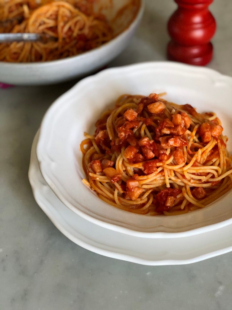 - Amatriciana: la pastasciutta più famosa, dopo il pomodoro e basilico. In pratica, una gricia che incontra il pomodoro. Perfetta se preparata con dei pelati rotti a mano un pò grossolani. Si parte dalla rosolatura del guanciale, poi si aggiunge il pomodoro e si aggiusta di sale, quindi il sugo risulta pronto quando i pelati concassè perdono acquosità, ed il grasso del guanciale affiora, creando un anello paglierino trasparente ai bordi del sugo lungo le pareti della pentola. Ci si finisce di cuocere la pasta ancora al dente, si spegne il fuoco, una girata di pecorino, una macinata di pepe ed è pronto.