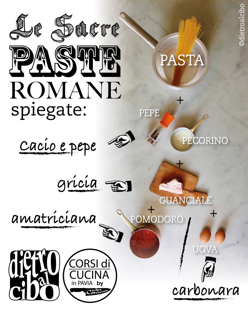 Una delle cose più sacre che si possono trovare a Roma sono le pastasciutte della tradizione. Come noi abbiamo risotti e cotoletta, loro hanno il ben di dio della pasta. Ricette che si contraddistinguono per la loro semplicità, ma che necessitano giustamente una grande conoscenza della tecnica, per evitare di rovinarle. Gli ingredienti utili sono: