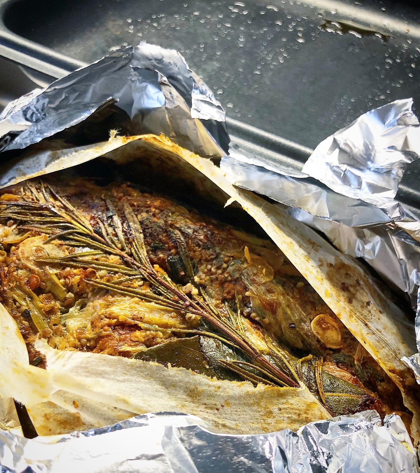 Fatto questo, il giorno seguente senza perdere cipollotti, aglio a filetti, erbe, spezie e quanto compone l’aromatizzazione della nostra marinatura, si prende la “fisarmonica” di costine e la si chiude in carta forno e a sua volta in un foglio di alluminio chiudendolo ermeticamente. Non metto la carne a diretto contatto dell’alluminio, perchè se si usa qualcosa di acido in marinatura, potrebbe sciogliere l’alluminio in cottura.