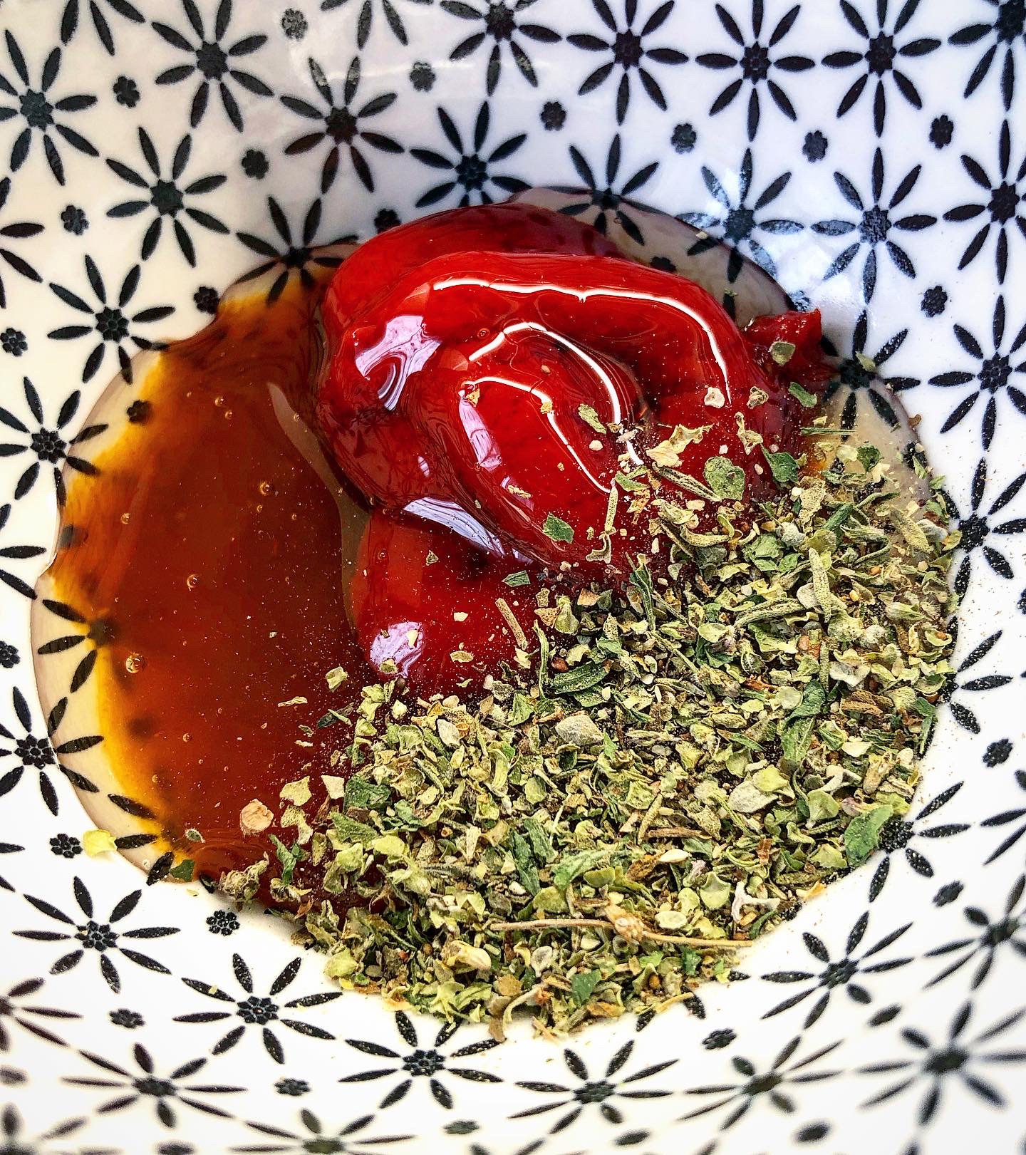 Come vedete qui sopra, c’è poi la seconda fase del nostro BBQ senza BBQ, ossia la “grigliatura”. Anche qui, potrete personalizzare il mix da spennellare in superficie a vostro piacere. Io ho messo salsa barbecue per l’affumicato e l’acidità, concentrato di pomodoro per la dolcezza, erbe aromatiche secche per la sapidità e miele d’acacia per far laccare bene il tutto. Nessuno vi vieta di pensare altri mix, come ad esempio miele leggermente diluito con una riduzione di birra infusa con aglio… insomma date sfogo alla vostra immaginazione (senza esagerare),