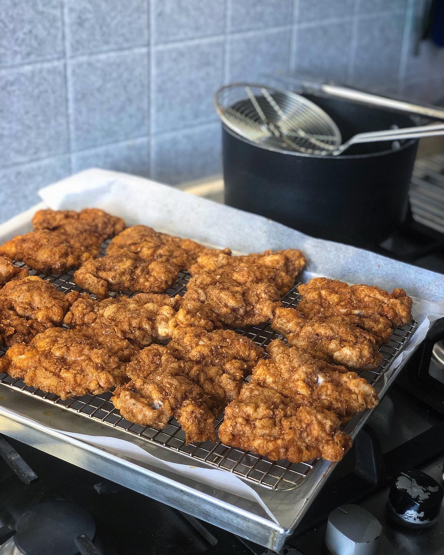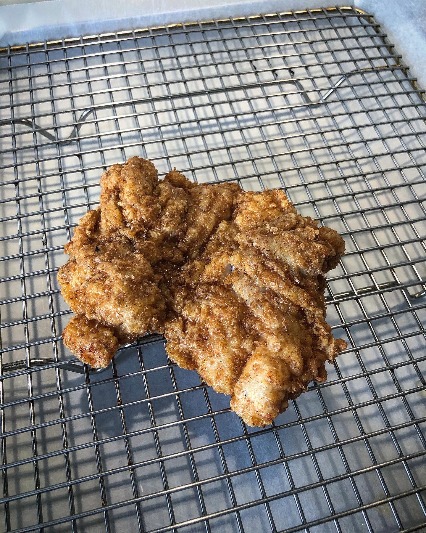 Il giorno seguente, poco prima di friggere, ho passato il pollo e latticello nella farina con un richiamo delle 11 spezie. Una volta infarinate a dovere, le sovracosce disossate finiscono a friggere velocemente in olio caldissimo, una alla volta per 2 o 3 minuti …e poi disposte su griglia, pronte ad andare in forno a 210° a terminare la cottura per 15/20 minuti. Una volta superati i 75º al cuore, sono pronte! Naturalmente per provare la temperatura al cuore si usa la sonda di temperatura per la carne e si deve raggiungere il centro del prodotto (ossia la parte più distante dalla superficie esterna del prodotto).