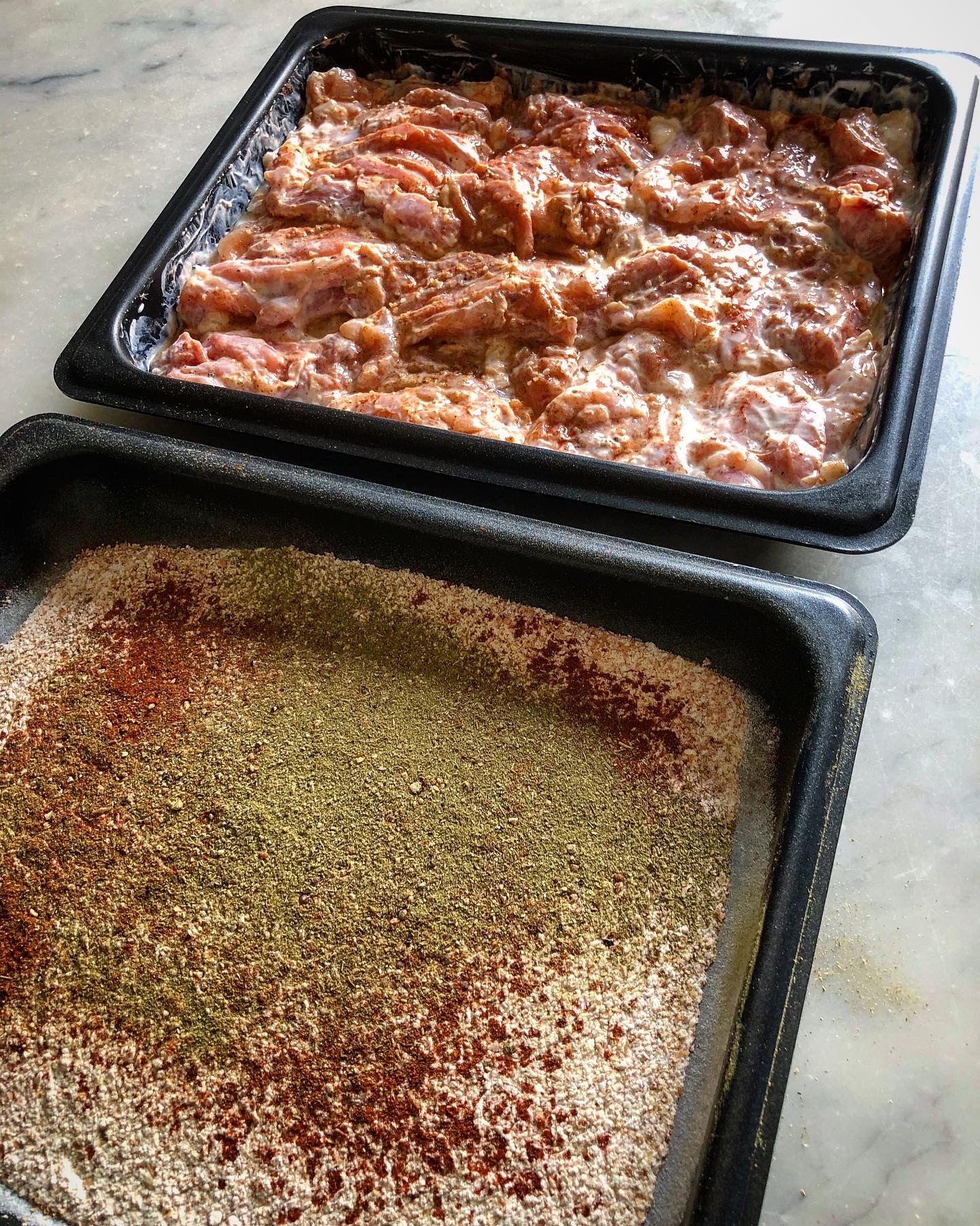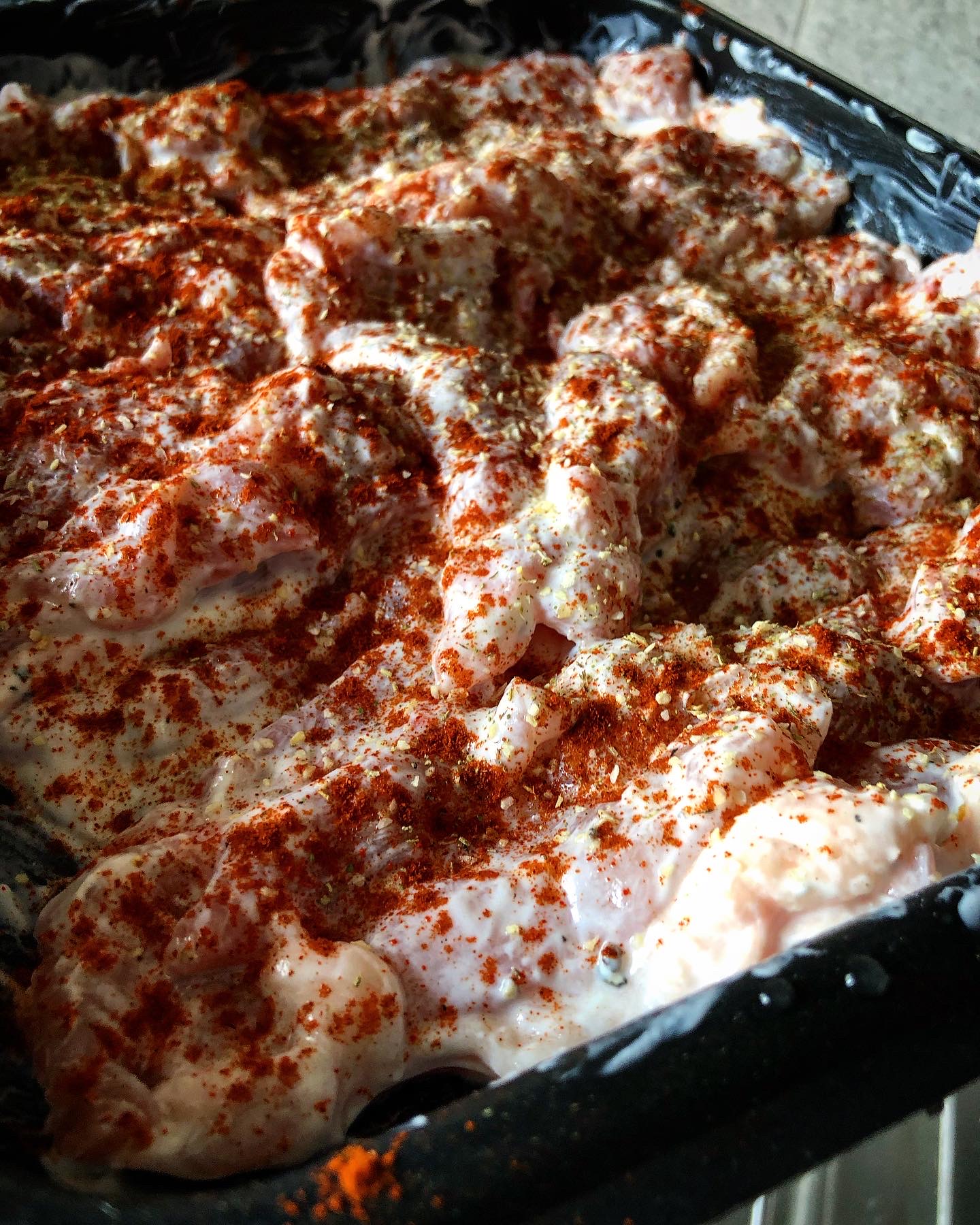 Ho aggiunto le spezie dell’original recipe ed il latticello. In mancanza di latticello potete usare lo yogurt naturale oppure ricreare il latticello mescolando in parti uguali un vasetto di yogurt e pari peso di latte, aggiungendo il succo di 1/2 limone. Per non complicarvi la vita, andate pure tranquilli usando il solo yogurt magro neutro. A questo latticello (o yogurt) ho già aggiunto le famose 11 spezie della O.R. Per quanto riguarda l’aglio secco, consiglio quello BIO Cannamela, perchè meno pungente.
