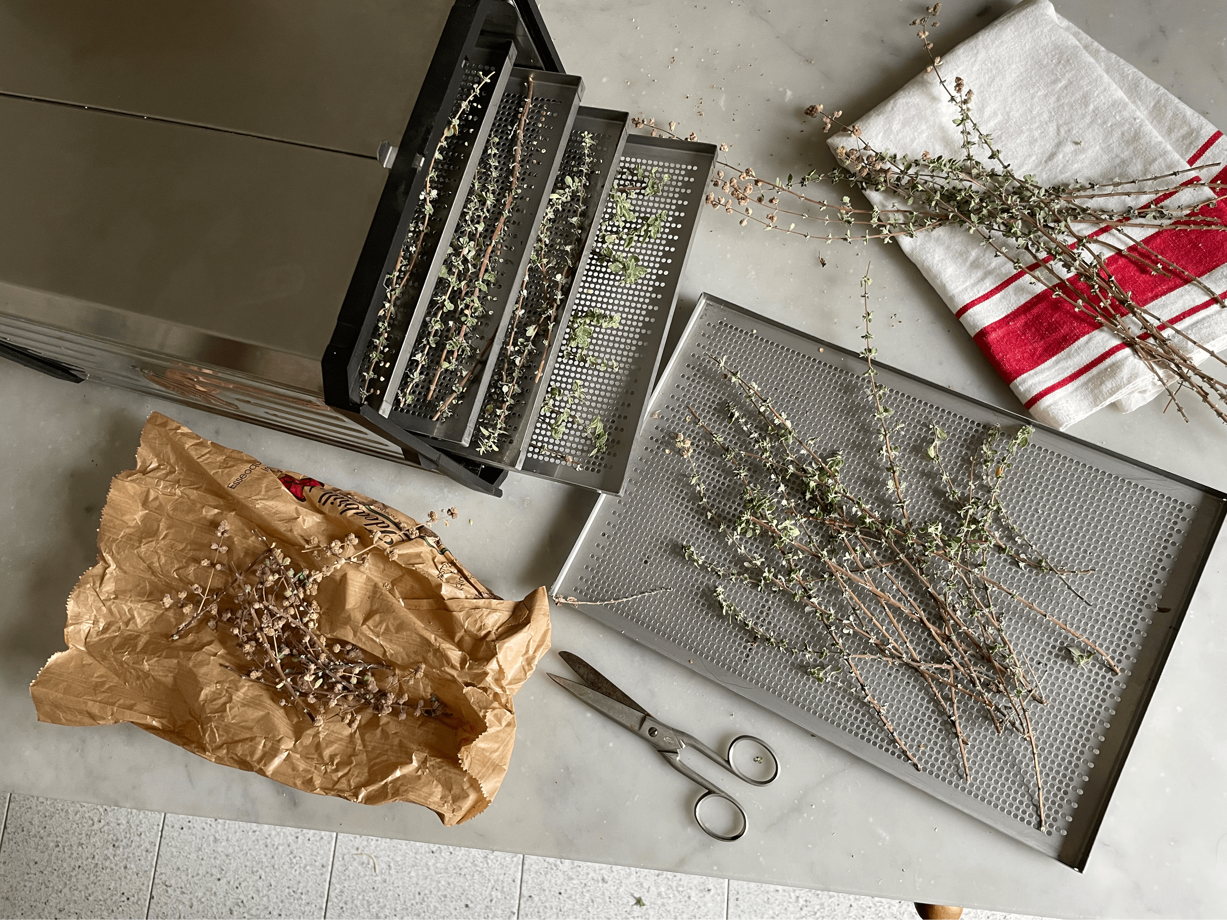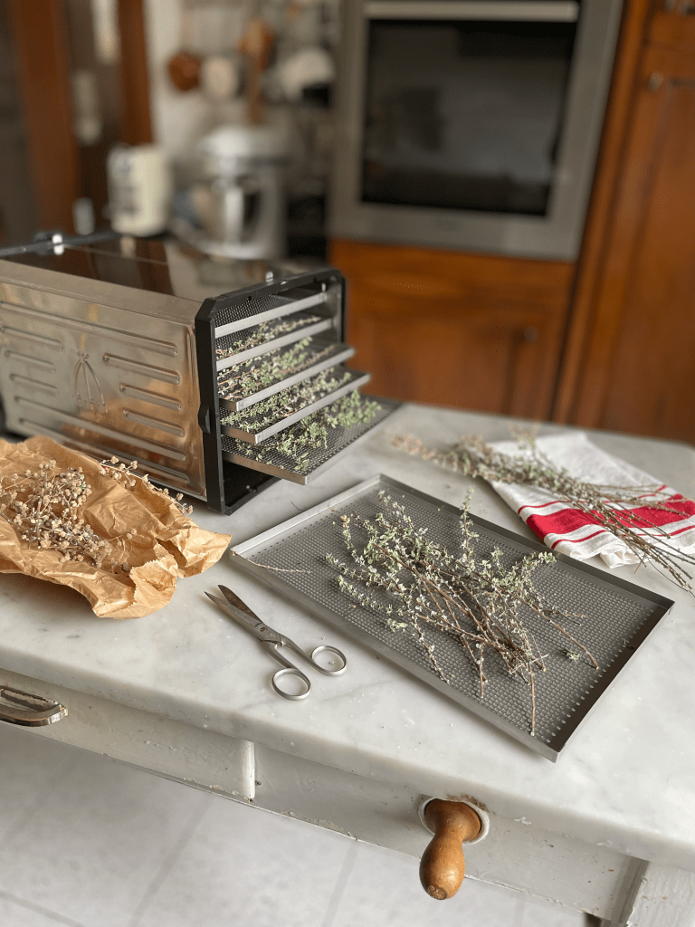 Detto, fatto. Ho iniziato a selezionare i rametti, togliendone l’infiorescenza in cima (le palline) e disponendoli nei ripiani di Atacama® il mio essiccatore by Tre Spade. Questo essiccatore è facilissimo da utilizzare, occupa pochissimo spazio, è silenzioso e non consuma quasi energia, perchè una volta a temperatura lavora con il mantenimento. Altra cosa che trovo utilissima è il sistema di flusso d’aria orizzontale, al contrario di molti altri essiccatori che lavorano in verticale con il risultato di essiccare in modo difforme i vari ripiani di prodotto.