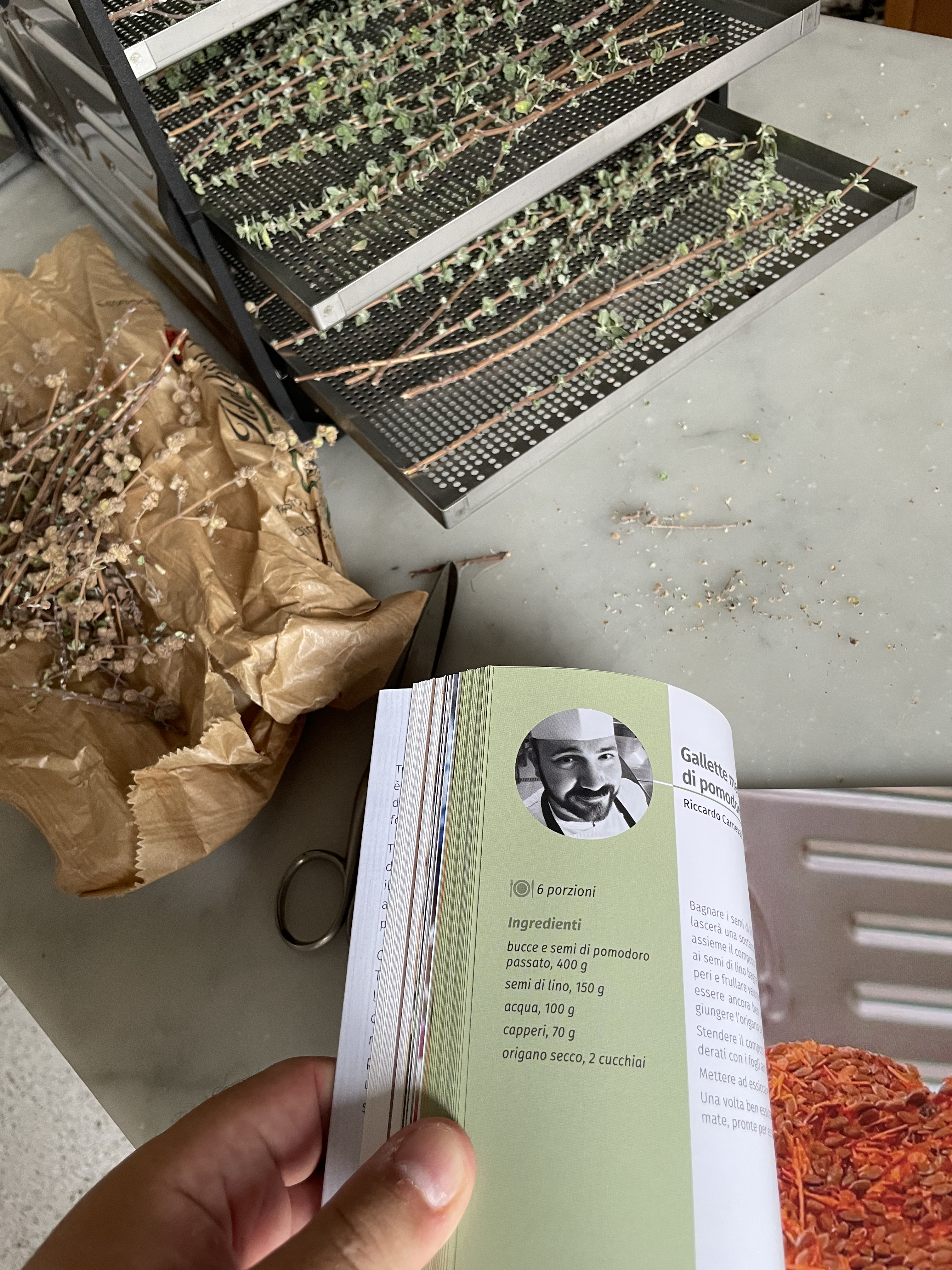 Di solito metto ad essiccare le erbe eliminando subito il loro gambo, in questo caso lo lascio perchè sarà poi semplicissimo sfogliarlo una volta essiccato. Per quanto riguarda temperature e tempistiche ho impostato manualmente 40°C e poi nel giro di 24 ore andrò a controllare empiricamente per constatare l’essiccazione completa. Infatti in base all’umidità presente normalmente nell’aria e alla percentuale variabile di umidità del prodotto i tempi possono variare. Per dare molte indicazioni in merito con Tre Spade abbiamo preparato il manuale “Io Essico” edito da TreSpade Academy (foto sotto).