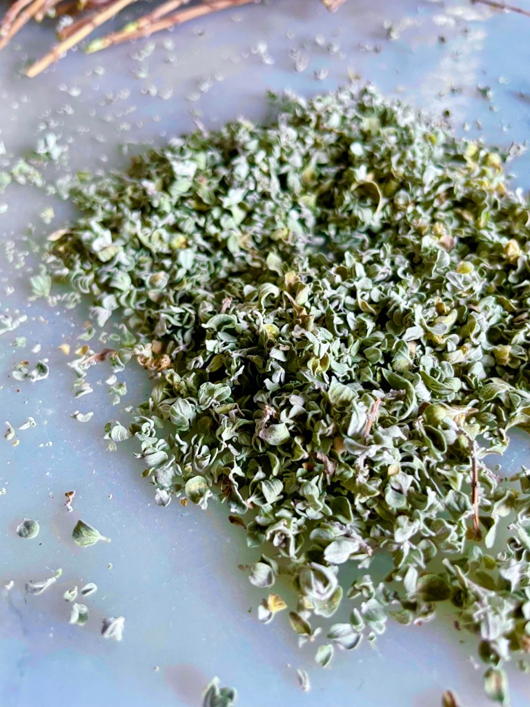 Una volta essiccato per bene, sfoglierò accuratamente il mio origano eliminando tutti i gambi e i rametti lasciando solo le foglie, chiudendole poi in un vasetto per conservarle asciutte e non perderne l’aroma. Saranno poi perfette per dare profumo a capresi di pomodoro e mozzarella, schiacciate di ceci, focacce, sulla pizza, insomma… ovunque il profumo dell’origano stia bene!