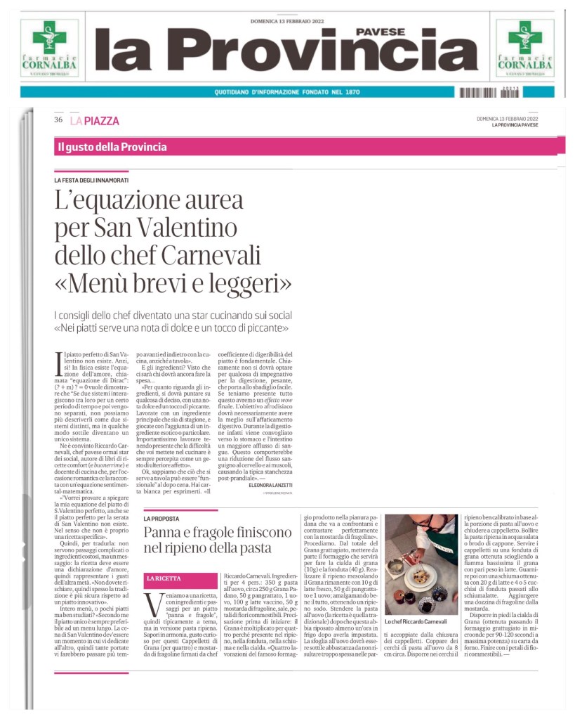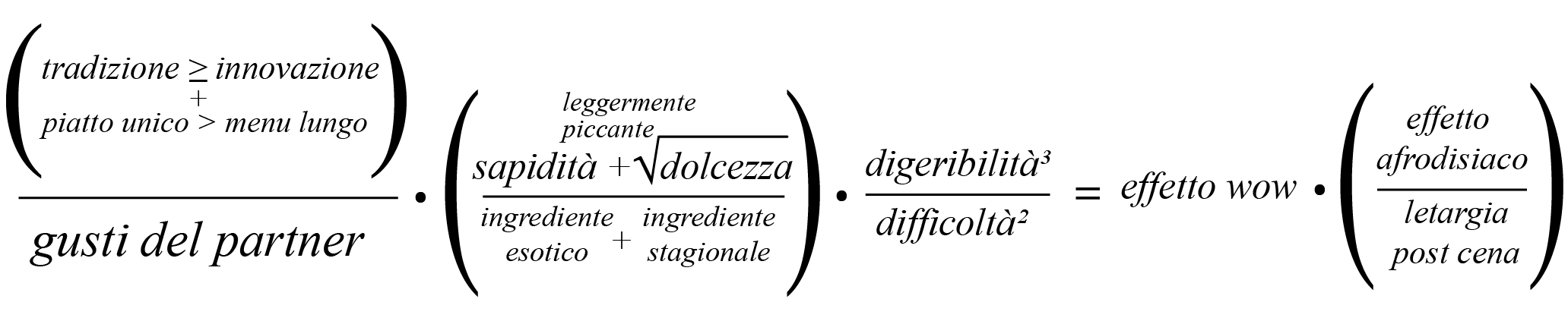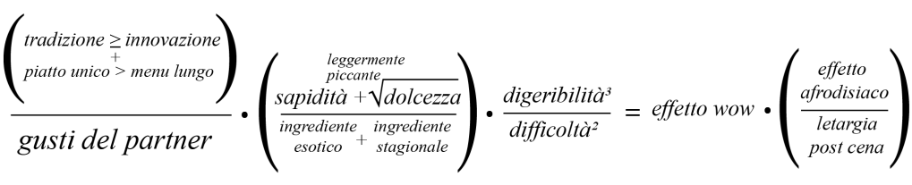 In fisica esiste l’equazione dell’amore, chiamata “equazione di Dirac”: (∂ + m) ψ = 0 vuole dimostrare che “Se due sistemi interagiscono tra loro per un certo periodo di tempo e poi vengono separati, non possiamo più descriverli come due sistemi distinti, ma in qualche modo sottile diventano un unico sistema”. Ora invece vi vorrei provare a spiegare la mia equazione del piatto di S.Valentino perfetto.